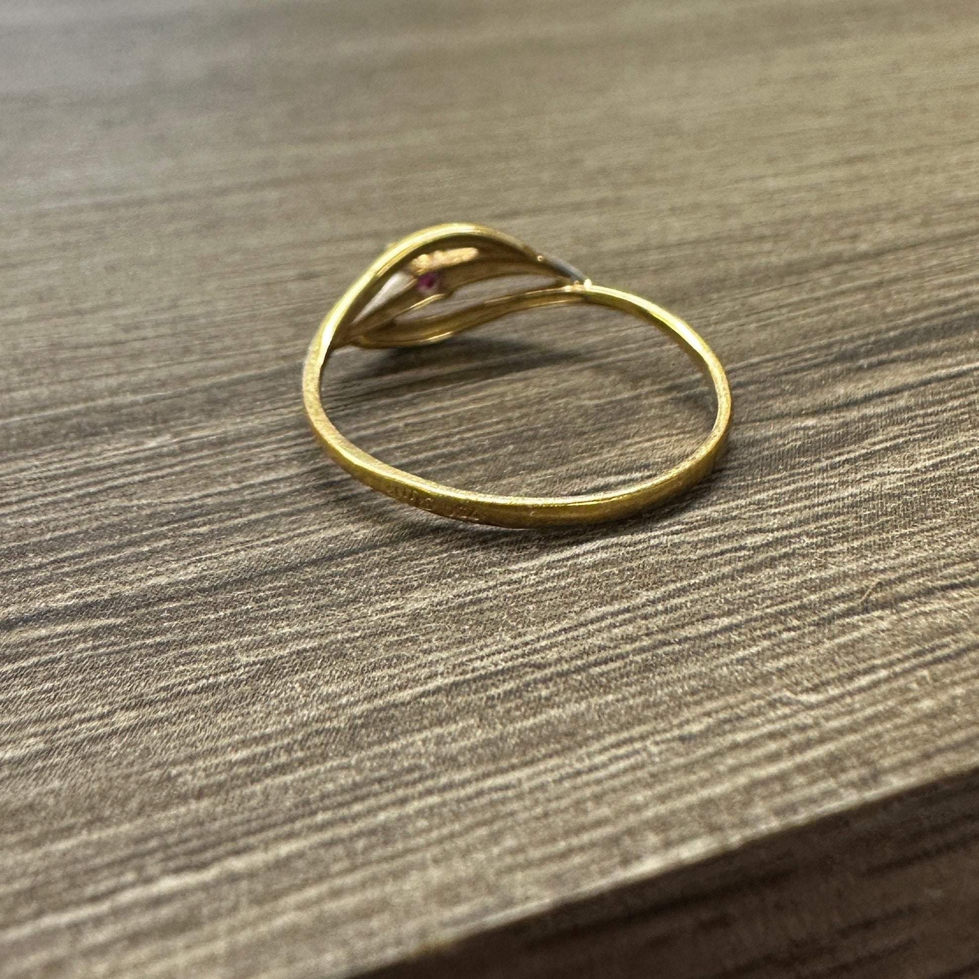 Bague en or jaune 18 carats (750/1000), ornée d’un rubis unique de 0,12 carat. Elle est de taille 54, pèse 1,07 g et est poinçonnée 750. Cette bague est en bon état, élégante et discrète, idéale pour une touche de couleur raffinée au quotidien ou pour offrir.