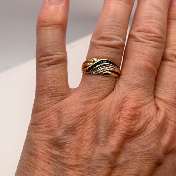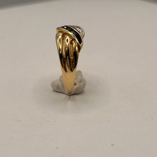 Bague empierrée en or jaune 18 carats (750/1000), poinçonnée Tête d’Aigle. Elle pèse 3,18 grammes et est de taille 55. Le bijou est serti de 10 petits saphirs et de 2 diamants Elle est en bon état général.