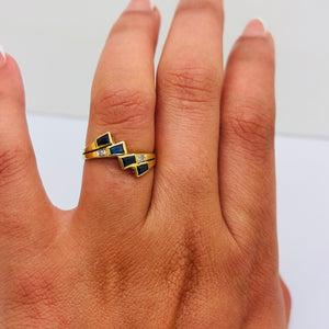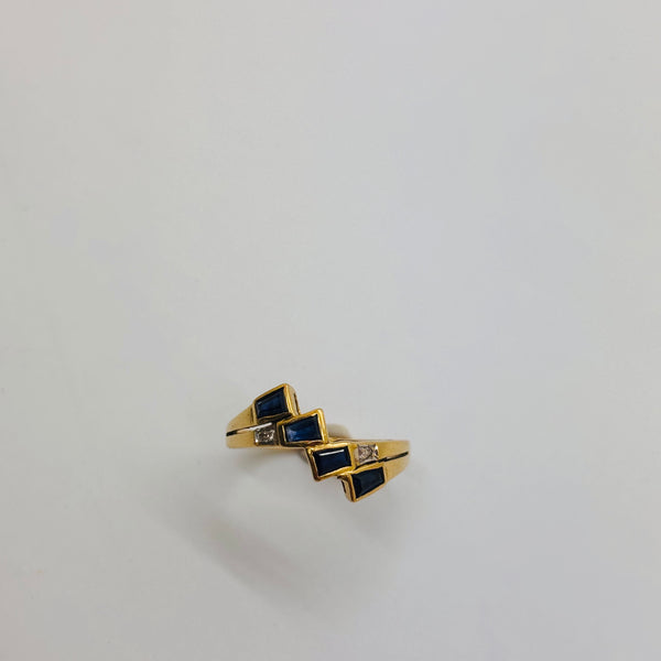 Bague empierrée en or jaune 750/1000 (18 carats), d’un poids de 2,41 g et de taille 54. Elle est ornée de 4 saphirs et de 2 éclats de diamants, offrant un joli contraste de pierres précieuses. Sans poinçon, cette pièce est en bon état.