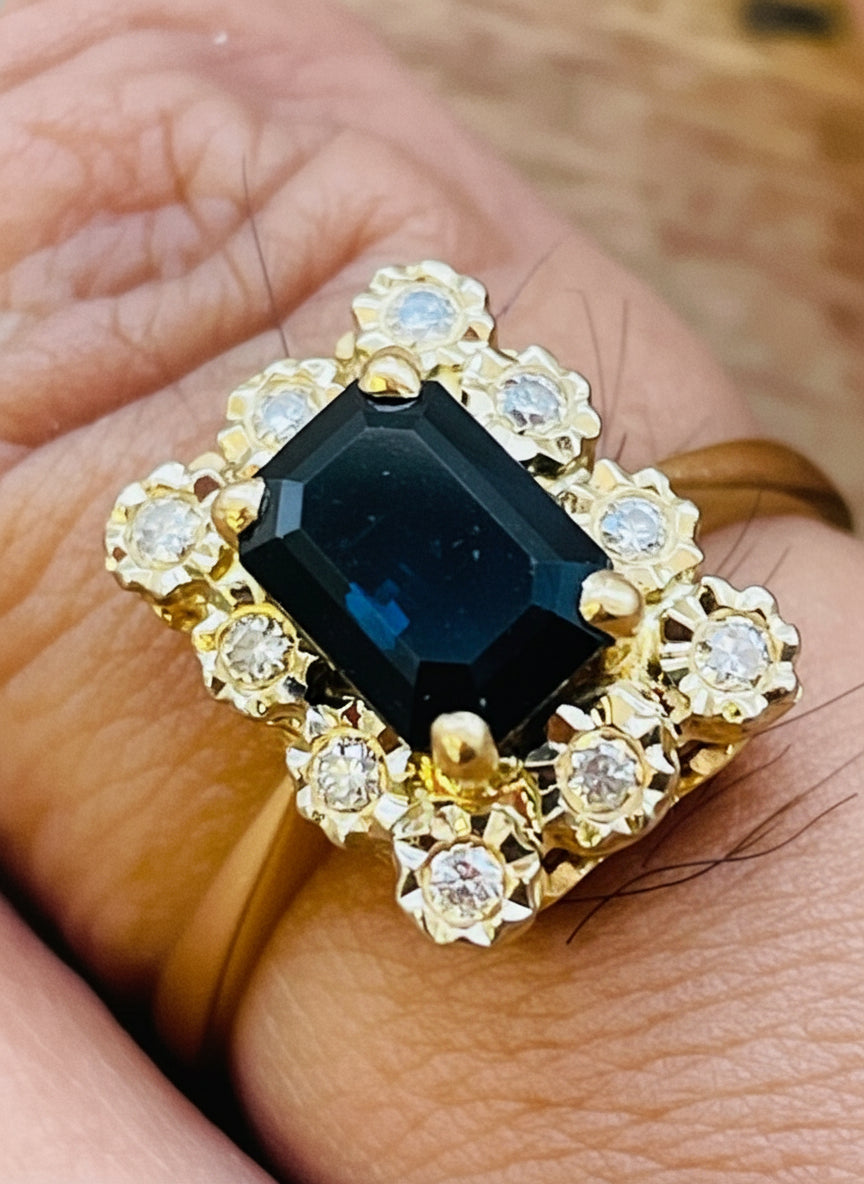 Élégante bague halo en or jaune 750/1000, poinçon Tête d’Aigle, au design lumineux et intemporel. Son saphir central est sublimé par un halo de diamants, offrant un éclat remarquable. Avec un poids de 3,77 g et une taille 52, elle allie confort et finesse.