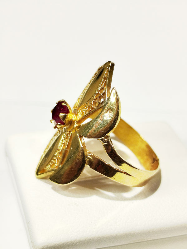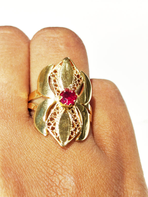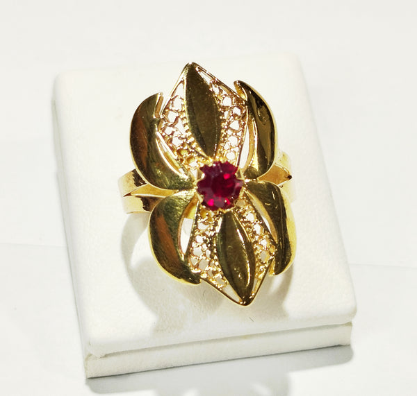 Bague en or jaune 14 carats (585/1000). Pesant 4.46 grammes. Ornée d'une pierre en oxyde de zirconium rouge. Taille 56.