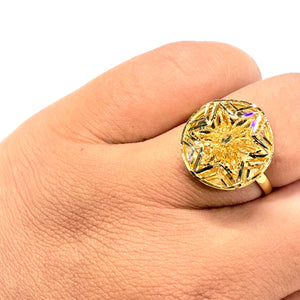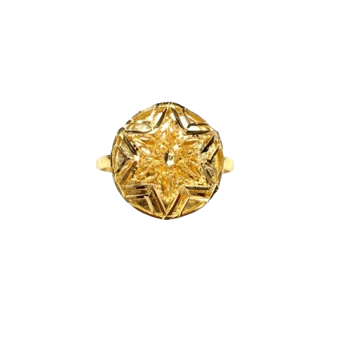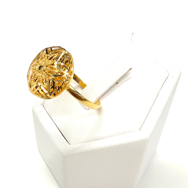 Bague finement travaillée, conçue en or jaune titré à 21 carats, comme en atteste son poinçon. Elle pèse 2,17 grammes et correspond à une taille 57. Cette pièce ne comporte aucune pierre et se trouve dans un très bon état de conservation.