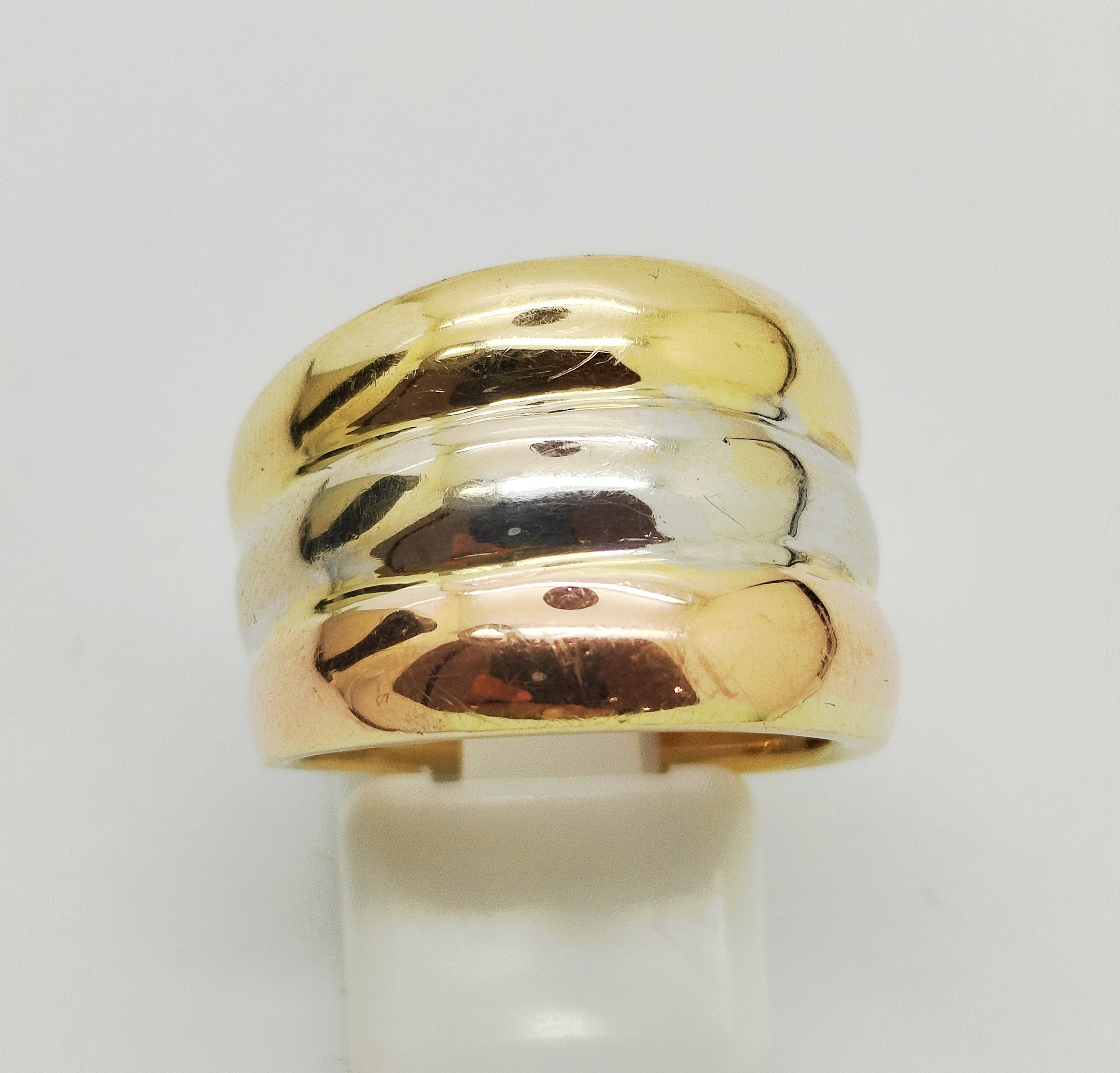 Bague en or jaune, or rose et or blanc 18 carats (750), poids 5,20 g, taille 54. Sa combinaison de trois ors lui confère un style élégant et harmonieux, parfait pour toutes les occasions. Pièce raffinée en bon état, idéale pour compléter une collection ou offrir un cadeau intemporel.