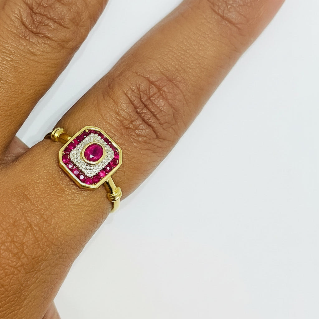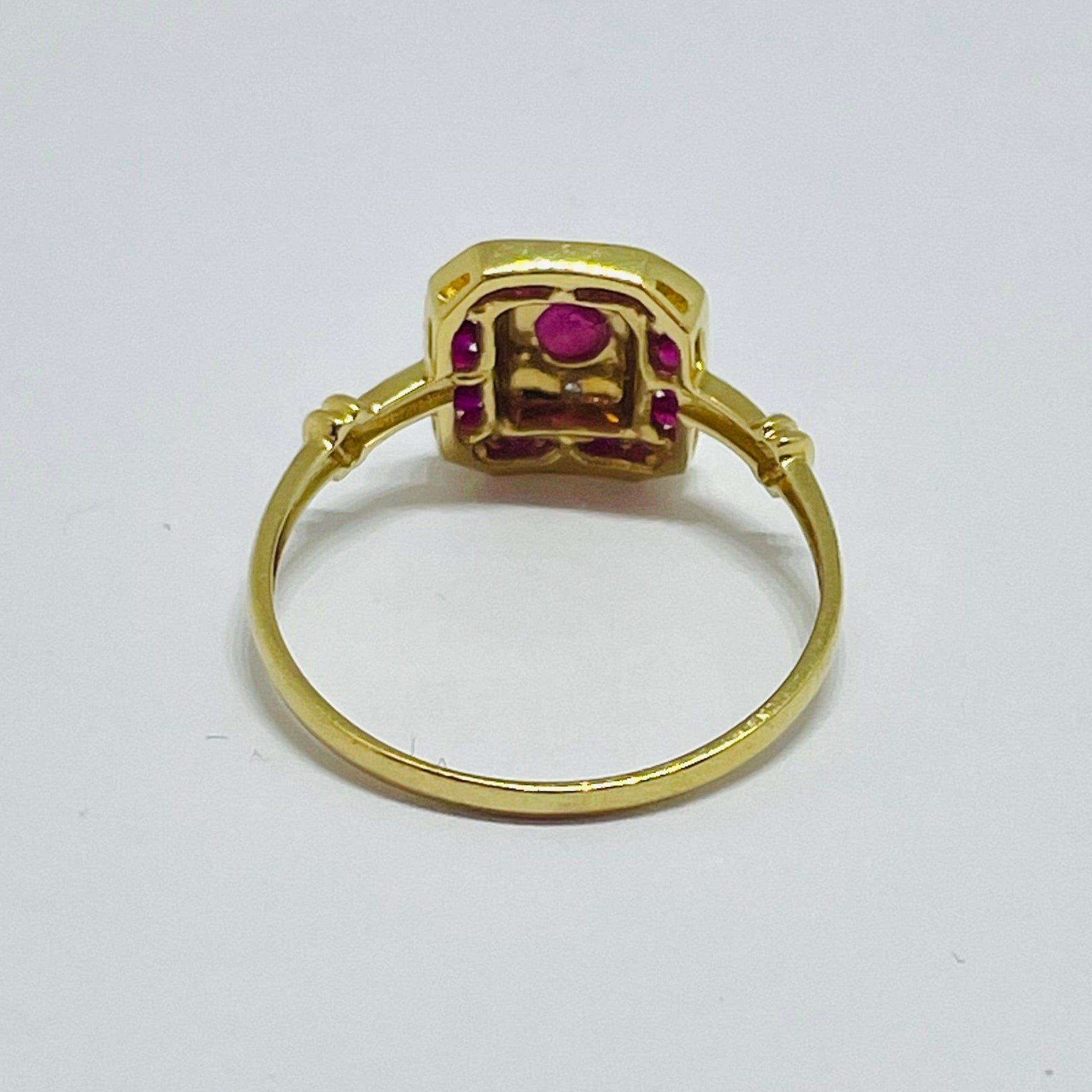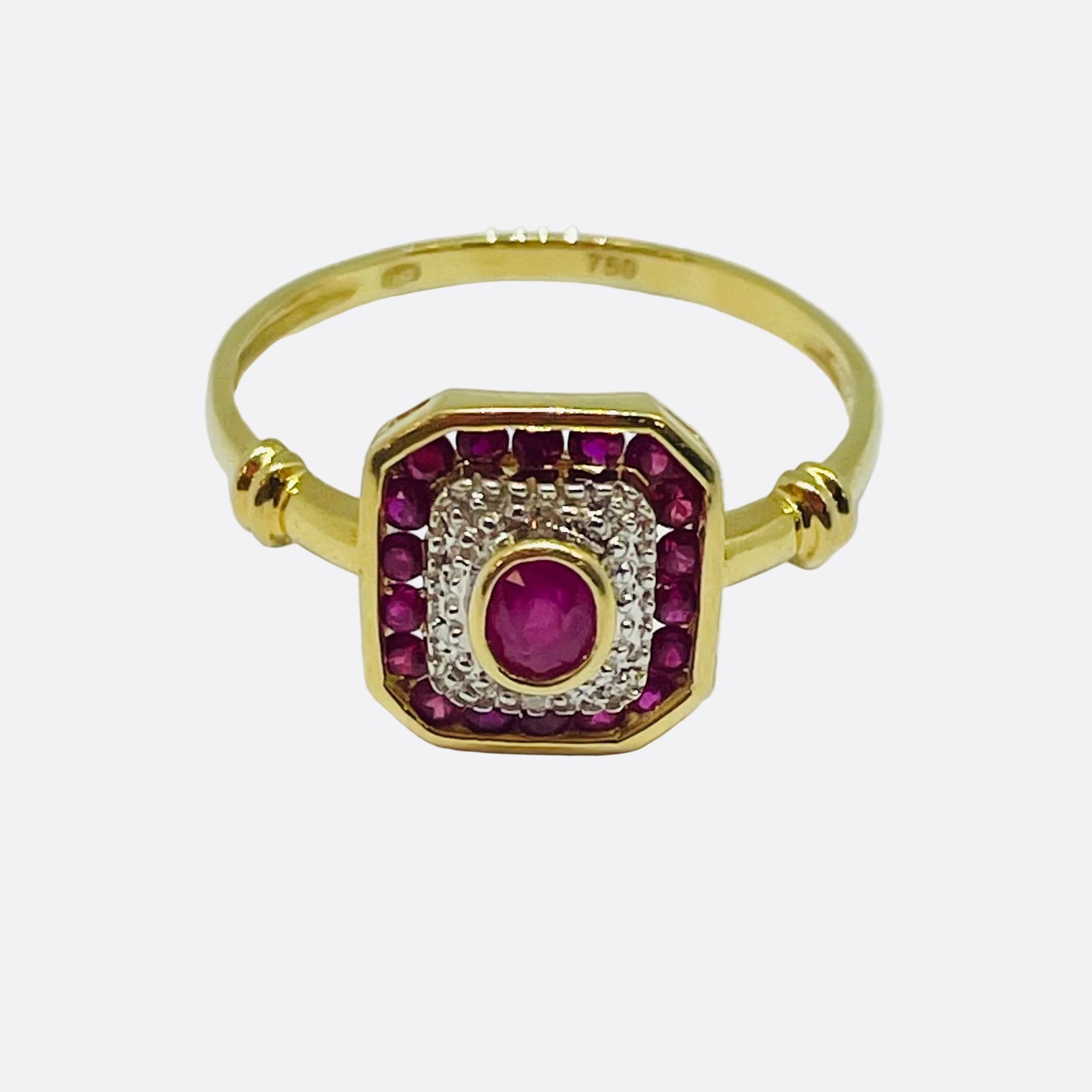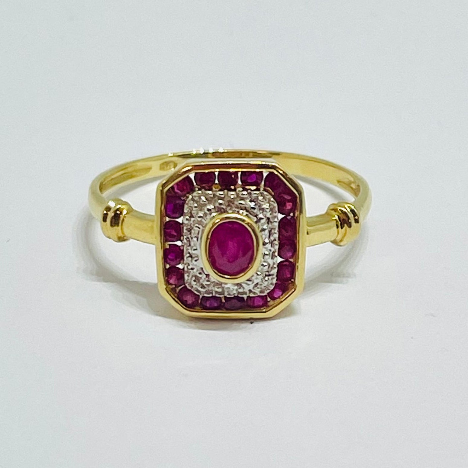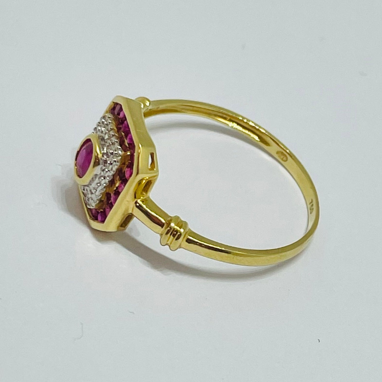 Bague empierrée en or jaune 18 carats (750/1000), poinçonnée 750, alliant élégance et brillance. Les pierres en oxyde de zirconium et rubis apportent un contraste lumineux qui met en valeur l’éclat de l’or. D’un poids de 2,58 g et en taille 57, elle assure un porté confortable.