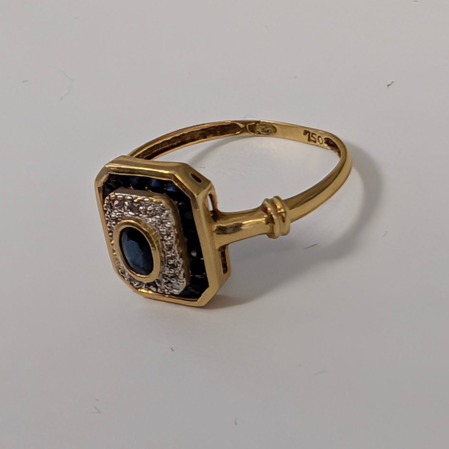 Cette bague empierrée en or jaune 750/1000, poinçonnée Tête d’Aigle, affiche un poids de 2,58 g et une taille 53. Elle est sertie de diamants et d’un saphir, comprenant deux diamants de 0,01 ct et des pierres