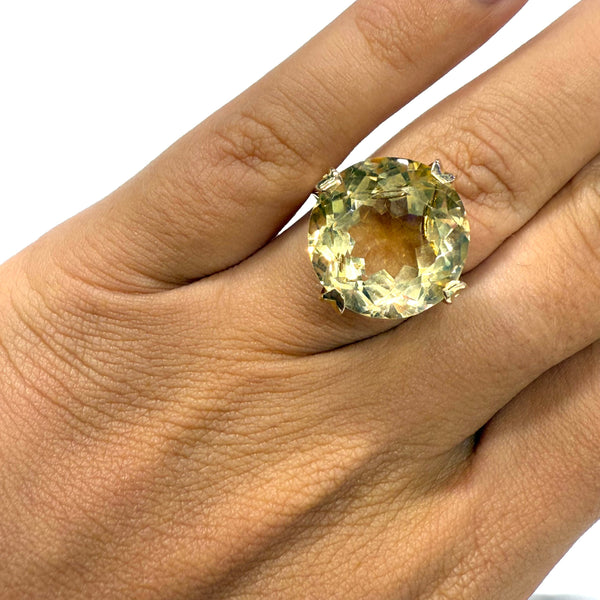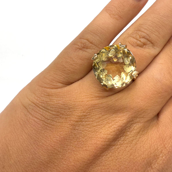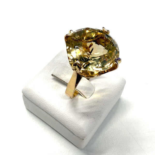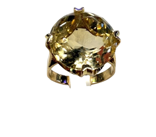 Bague empierrée en or jaune 18 carats (750/1000), poinçonnée Tête d’Aigle, d’un poids de 6,74 grammes et proposée en taille 54. Elle est sertie d’une citrine de 1,6 cm de diamètre, apportant une touche de couleur chaleureuse et lumineuse à l’ensemble.