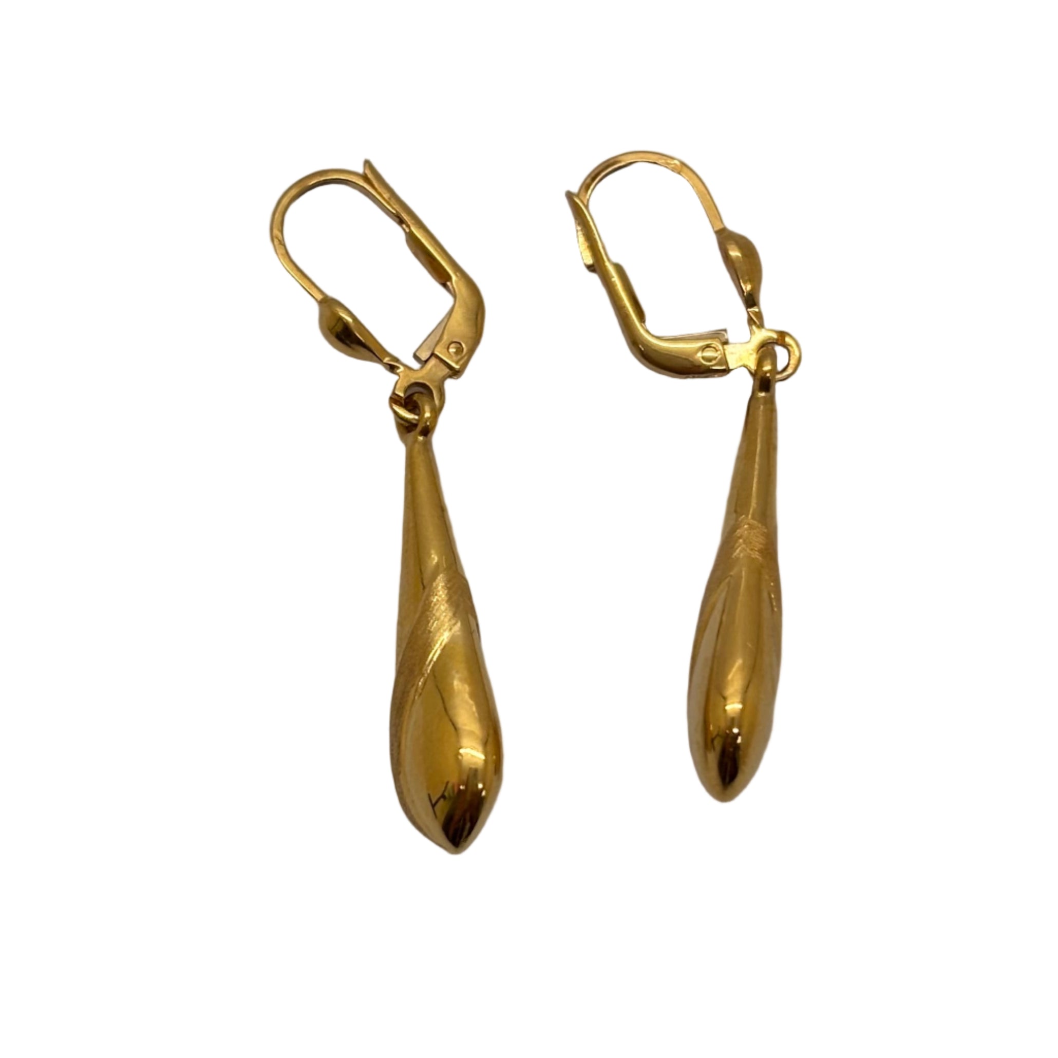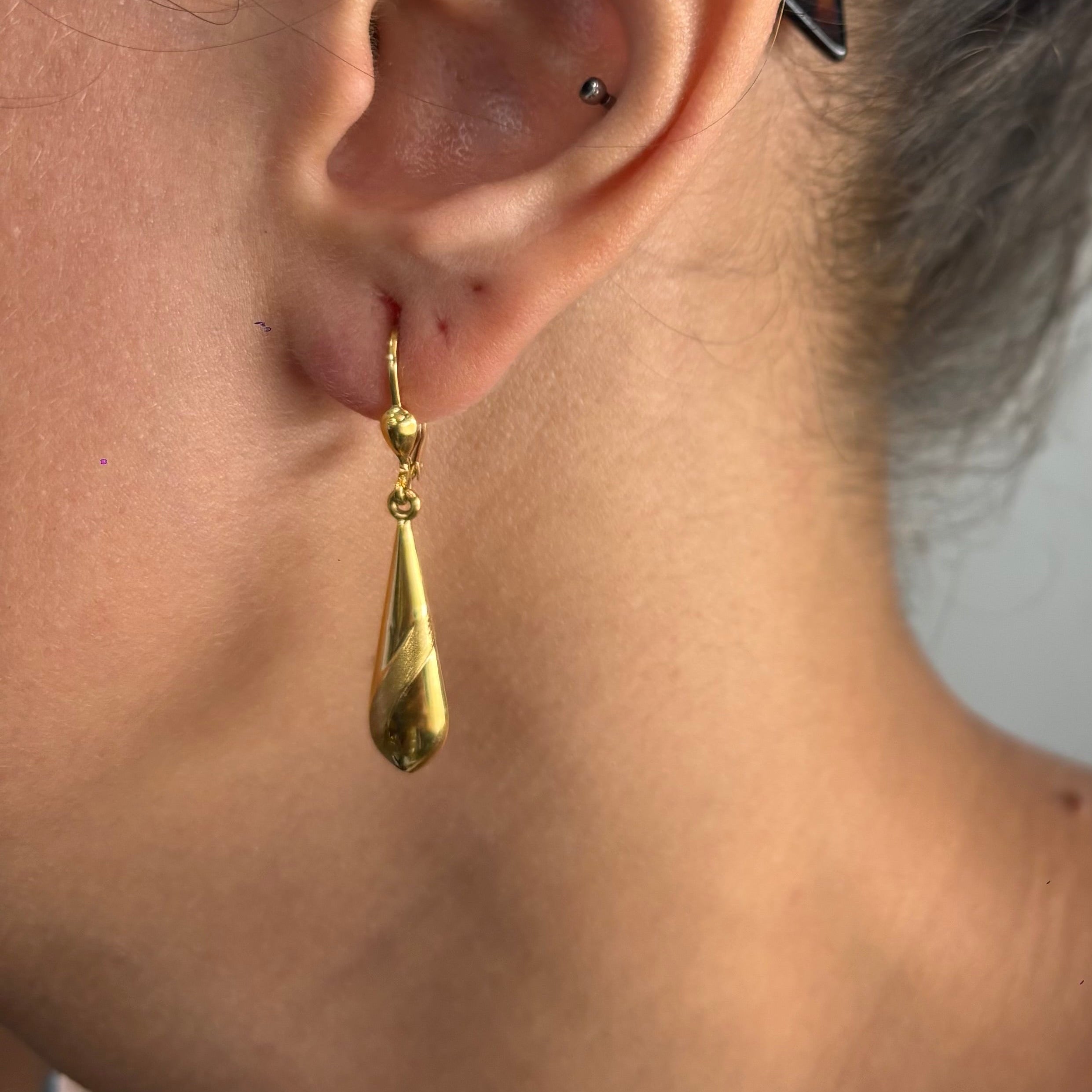 Elles présentent un fermoir en dormeuses et mesurent 3.8 CM de hauteur, 5 MM de largeur et 2 MM d'épaisseur. Poinçonnées 750, elles sont en parfait état, comme neuves.