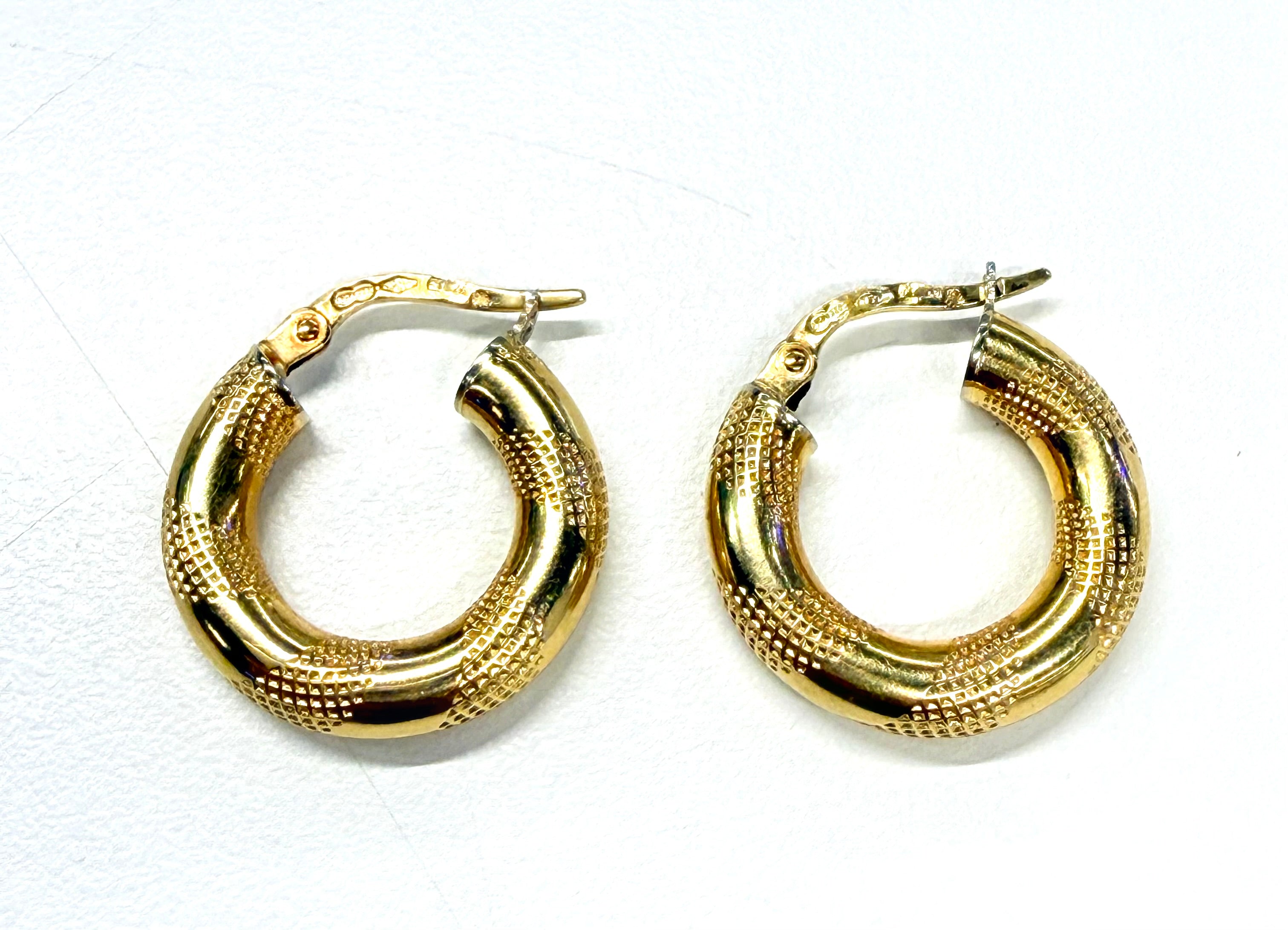 Boucles d’oreilles de type créoles en or jaune 18 carats (750/1000), dotées d’un fermoir à cliquet. Elles pèsent 2,38 grammes, mesurent 1,9 cm de hauteur, 1,7 cm de largeur et 0,3 cm d’épaisseur. Ces boucles sont en très bon état.