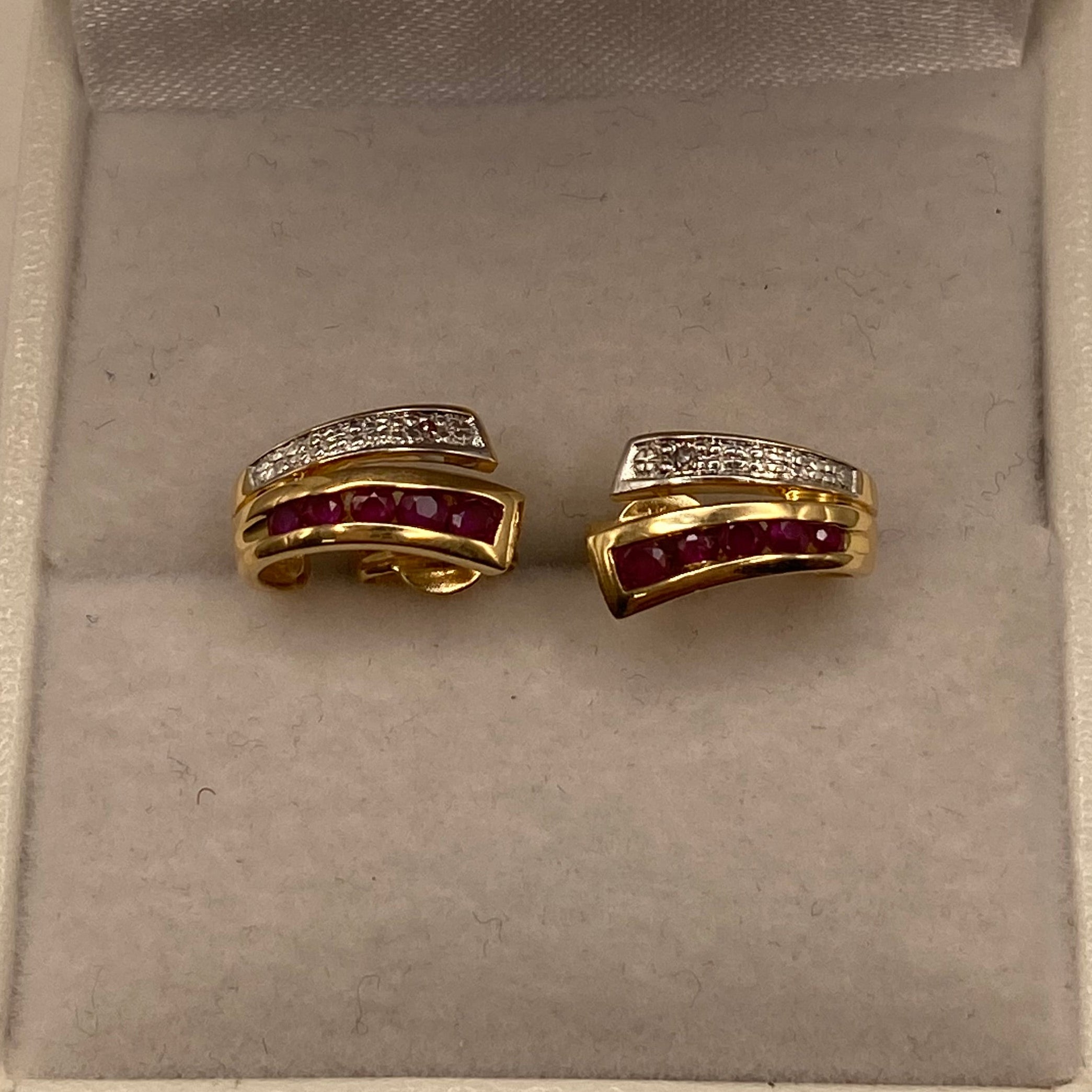 Ces boucles d’oreilles clous en or jaune 18 carats (750/1000) allient finesse et élégance. Serties de 10 petits rubis et de 2 brillants, elles offrent un éclat subtil et raffiné, idéal pour un port quotidien comme pour les occasions spéciales.