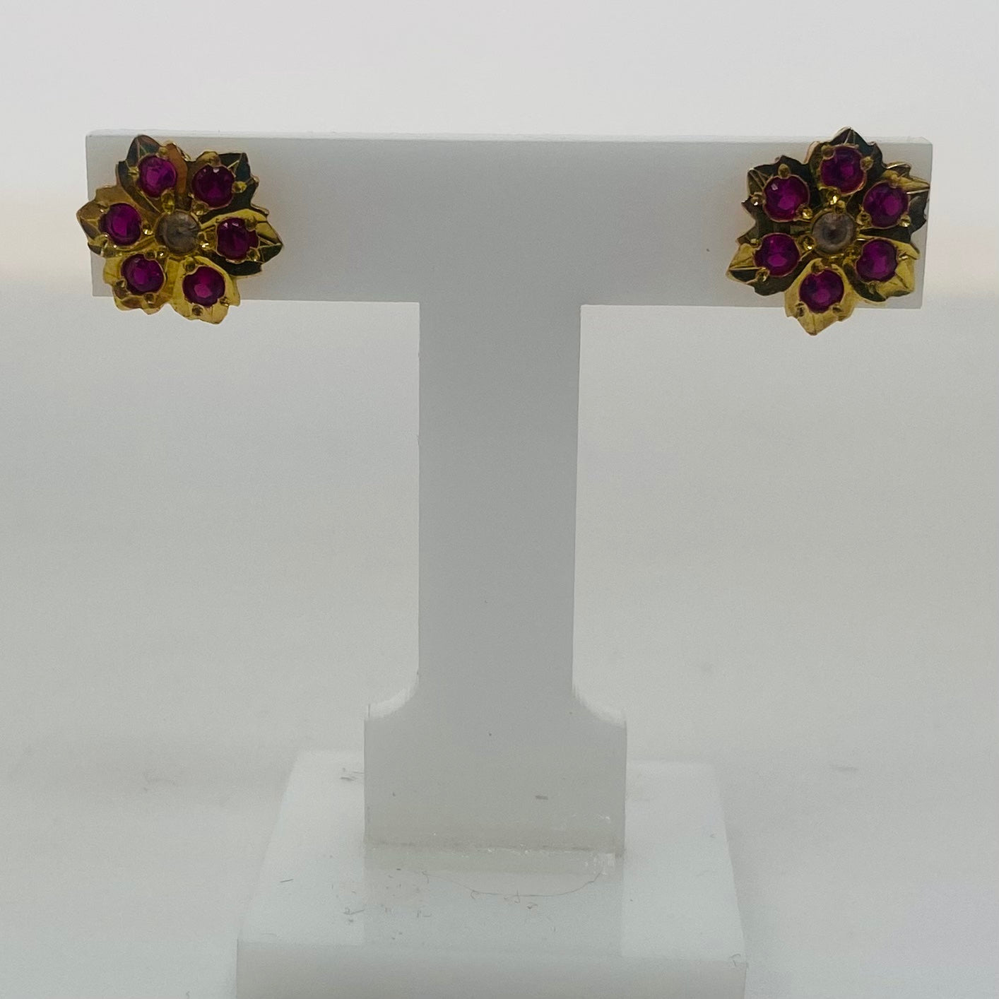 Boucle d’oreille en or jaune en forme de marguerite avec des pierres rose et un zirconium