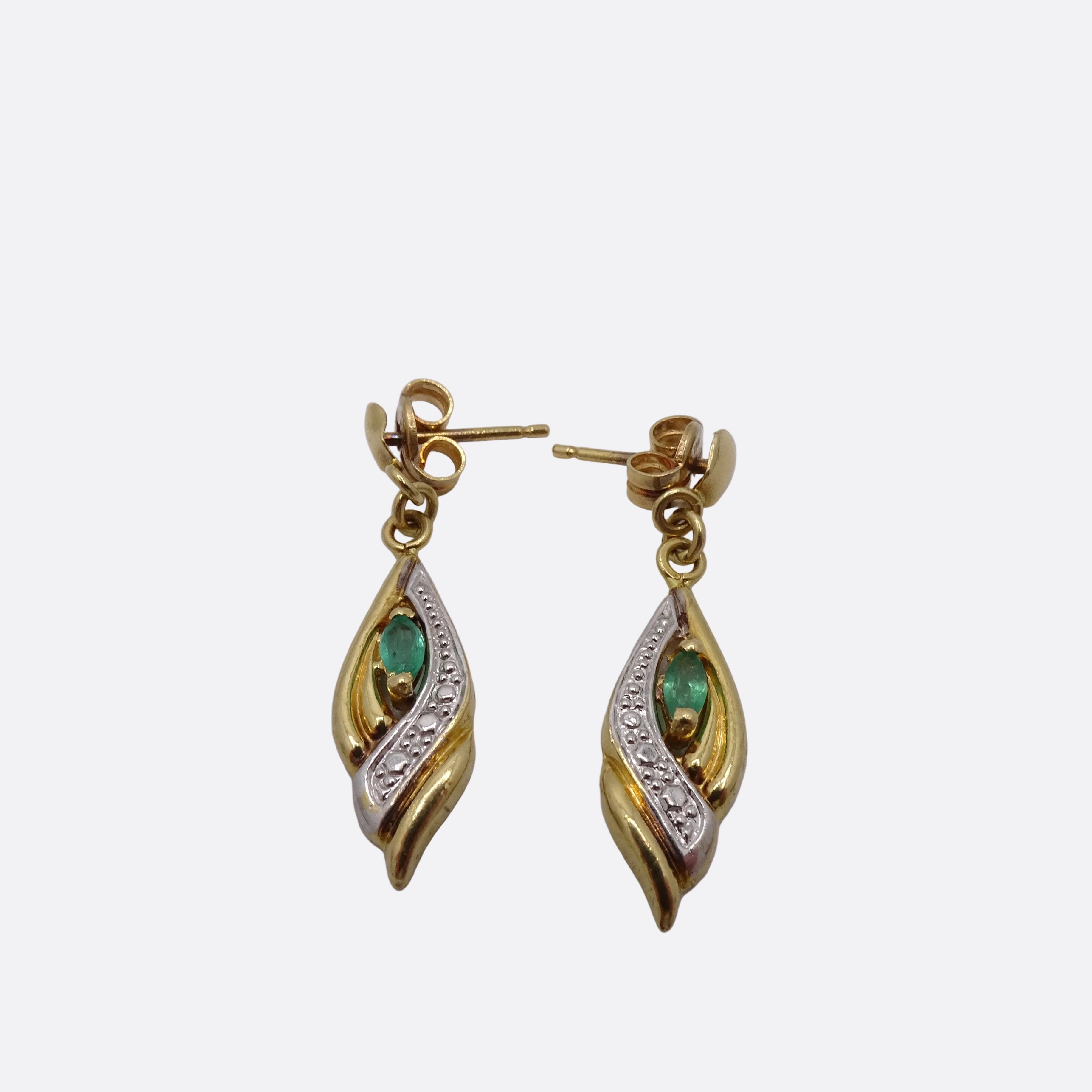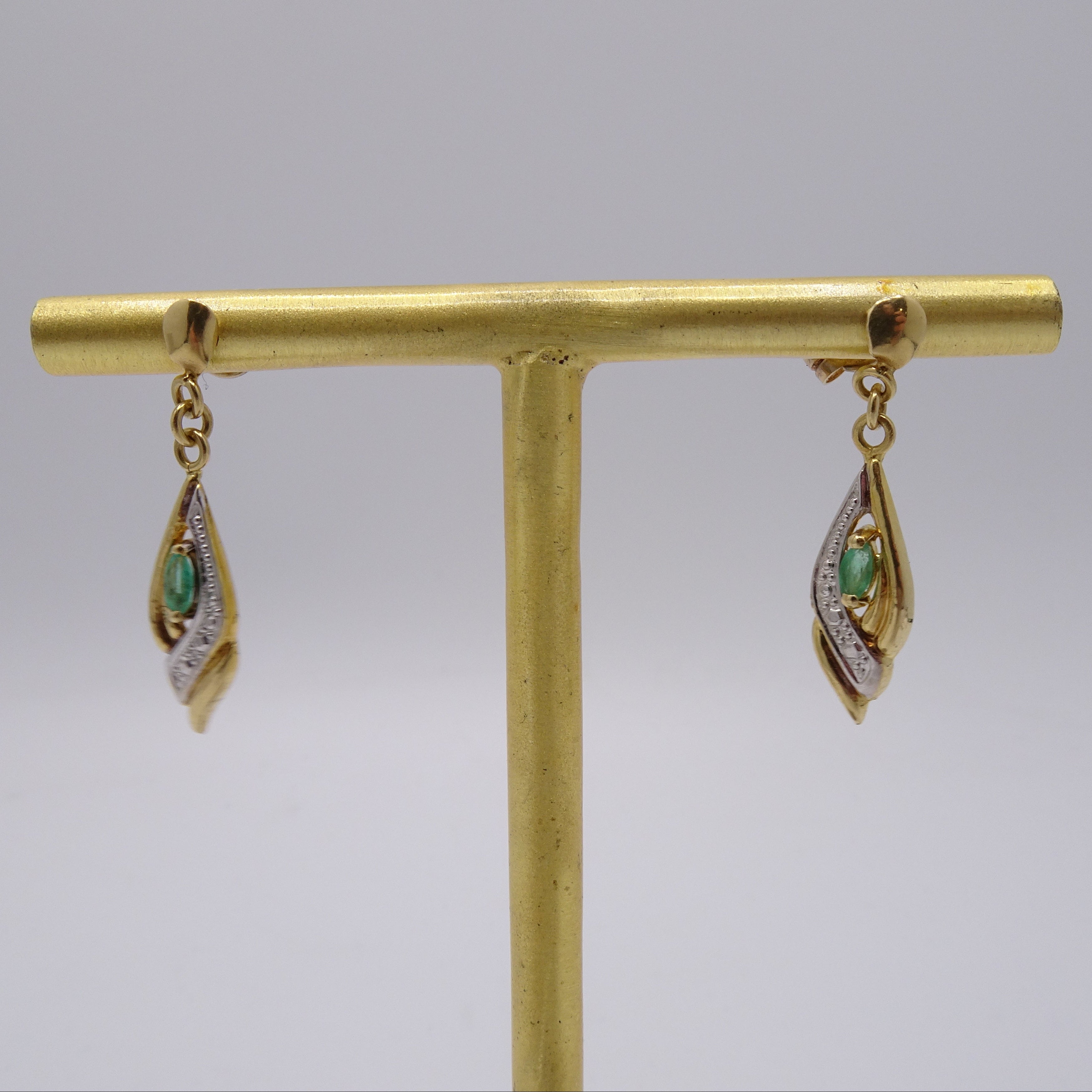 Boucles d’oreilles pendantes en or jaune 18 carats, poinçonnées Tête d’Aigle, avec fermoir poussettes. Légères (1,37 g) et fines (2,4 cm × 6,4 mm, épaisseur 1,5 mm), elles sont ornées de 2 pierres d’aventurine offrant une touche de couleur naturelle.