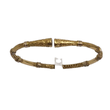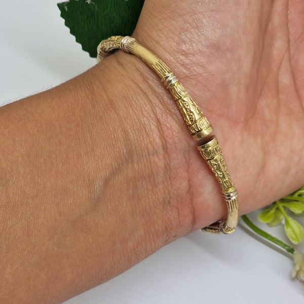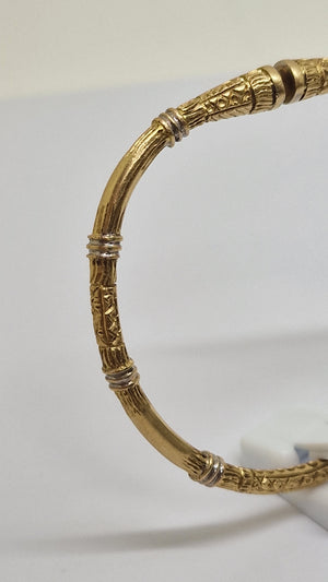 Jonc en or jaune et or blanc 18 carats (750/1000), poinçonné tête d’aigle, en très bon état. Ce bijou sans fermoir présente une forme rigide classique, avec une longueur de 6 cm, une largeur de 6,5 cm et une épaisseur de 4 mm. Son poids est de 30,98 grammes, et il ne contient aucune pierre. Un modèle élégant et intemporel, idéal pour une touche raffinée au poignet.