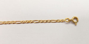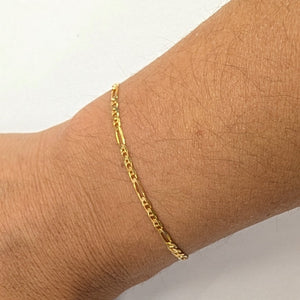Bracelet à maillons de type Figaro en or jaune 750/1000 (18 carats), poinçonné 750. Il mesure 18,5 cm de long, avec une largeur de 3 mm et une épaisseur de 0,5 mm, pour un poids de 2,06 g. Doté d’un fermoir à anneau ressort et sans pierres, ce bijou est en très bon état.