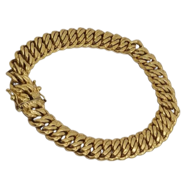 Bracelet à maillons de type américaine en or jaune 18 carats (750/1000), poinçonné 750 et tête d’aigle, en bon état. Il mesure 20,5 cm de long, avec une largeur de 1 cm et une épaisseur de 3 mm, pour un poids de 14,40 grammes. Ce modèle sans pierres est doté d’un fermoir à cliquet sécurisé.
