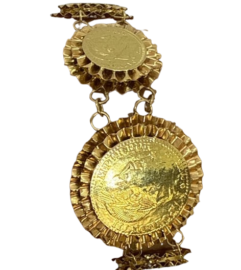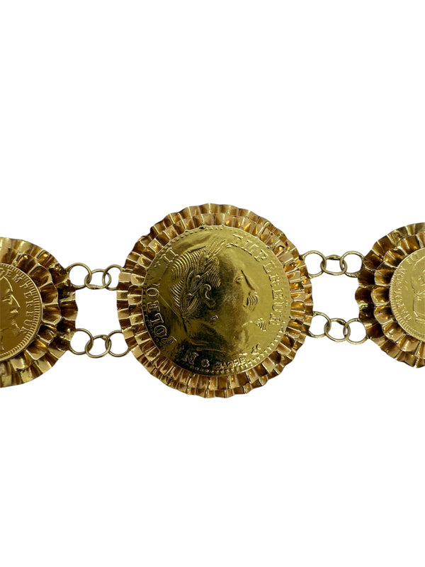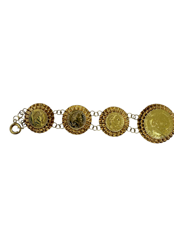 Bracelet de style Napoléon III, reproduction en or jaune 18 carats (750/1000), sans poinçon. Composé d’une maille jaseron large, il mesure 19 cm de long, 22 mm de large et 2 mm d’épaisseur, pour un poids de 10,48 grammes. Fermoir à anneau ressort. Une pièce élégante et distinctive, en très bon état.