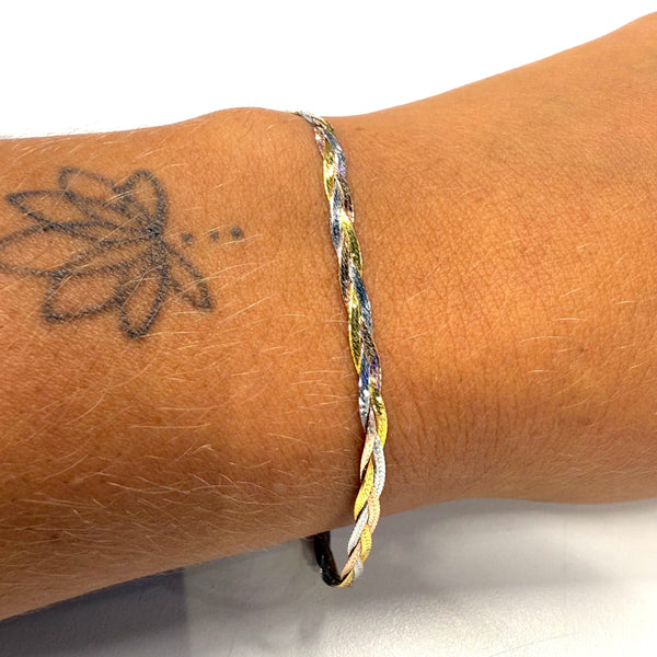 Bracelet tressé en or 18 carats (750/1000), associant harmonieusement or jaune, or blanc et or rose, poinçonné 750. Il mesure 19 cm de long, avec une largeur de 0,3 cm et une épaisseur de 0,1 cm. Son fermoir mousqueton assure un maintien sûr et discret.