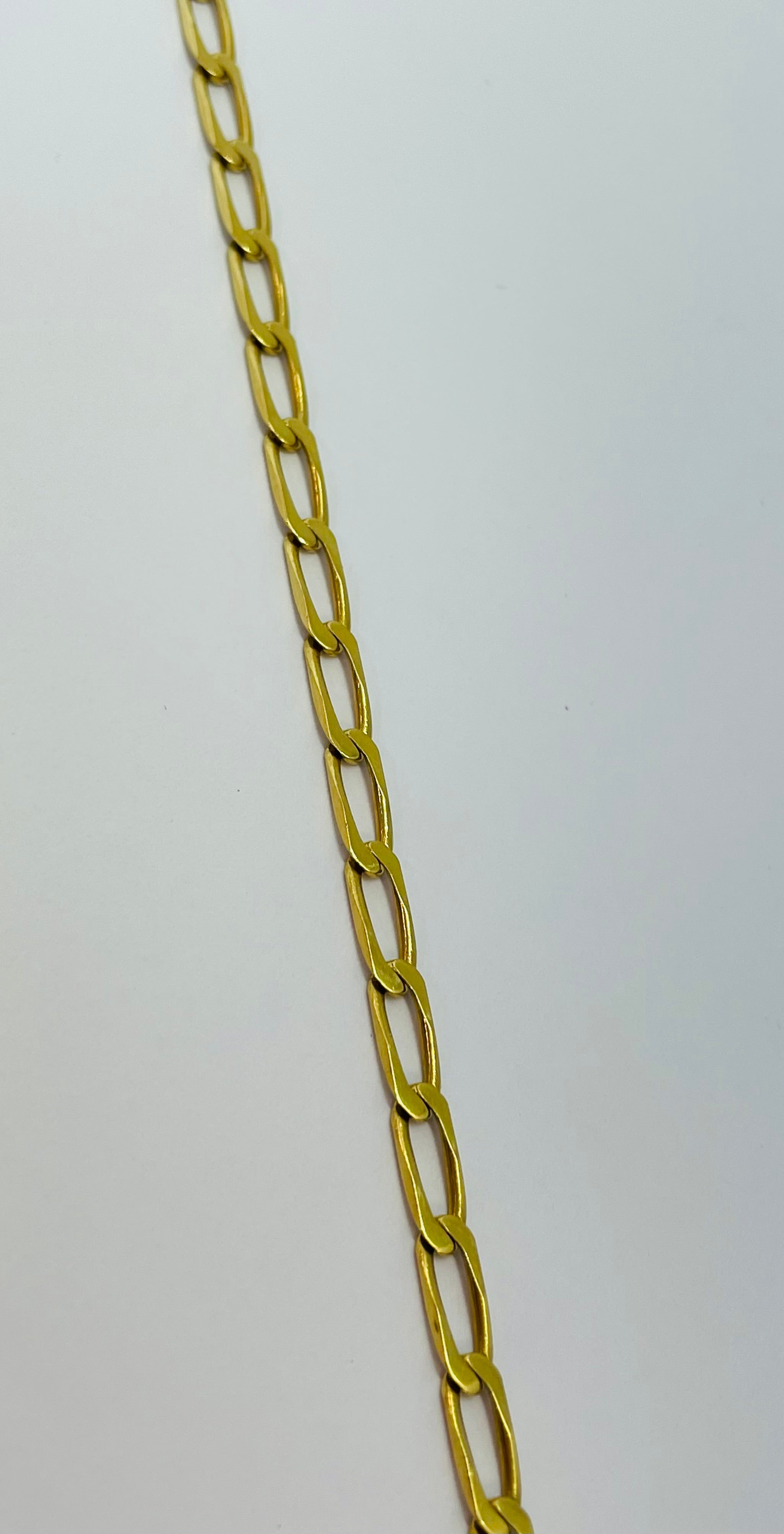 Collier matinée en or jaune 750/1000, maille cheval avec fermoir mousqueton. 20,09 g, 60 cm de longueur, 14,5 cm de largeur et 4 mm d’épaisseur. État comme neuf, élégant et lumineux.