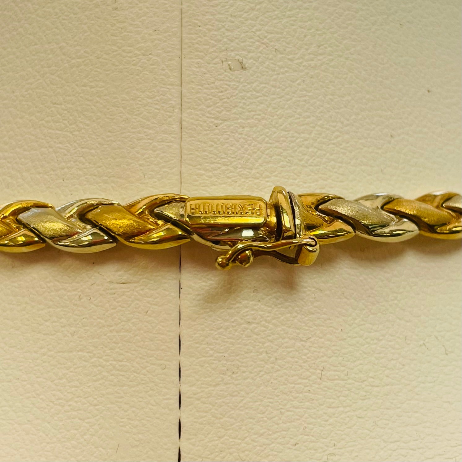 Collier ras du cou en or jaune et gris 18 carats (750/1000), poinçonné 750 et Tête de Chien. Poids : 21,12 g. Longueur : 45 cm. Maille originale, fermoir à cliquet. État : comme neuf.
