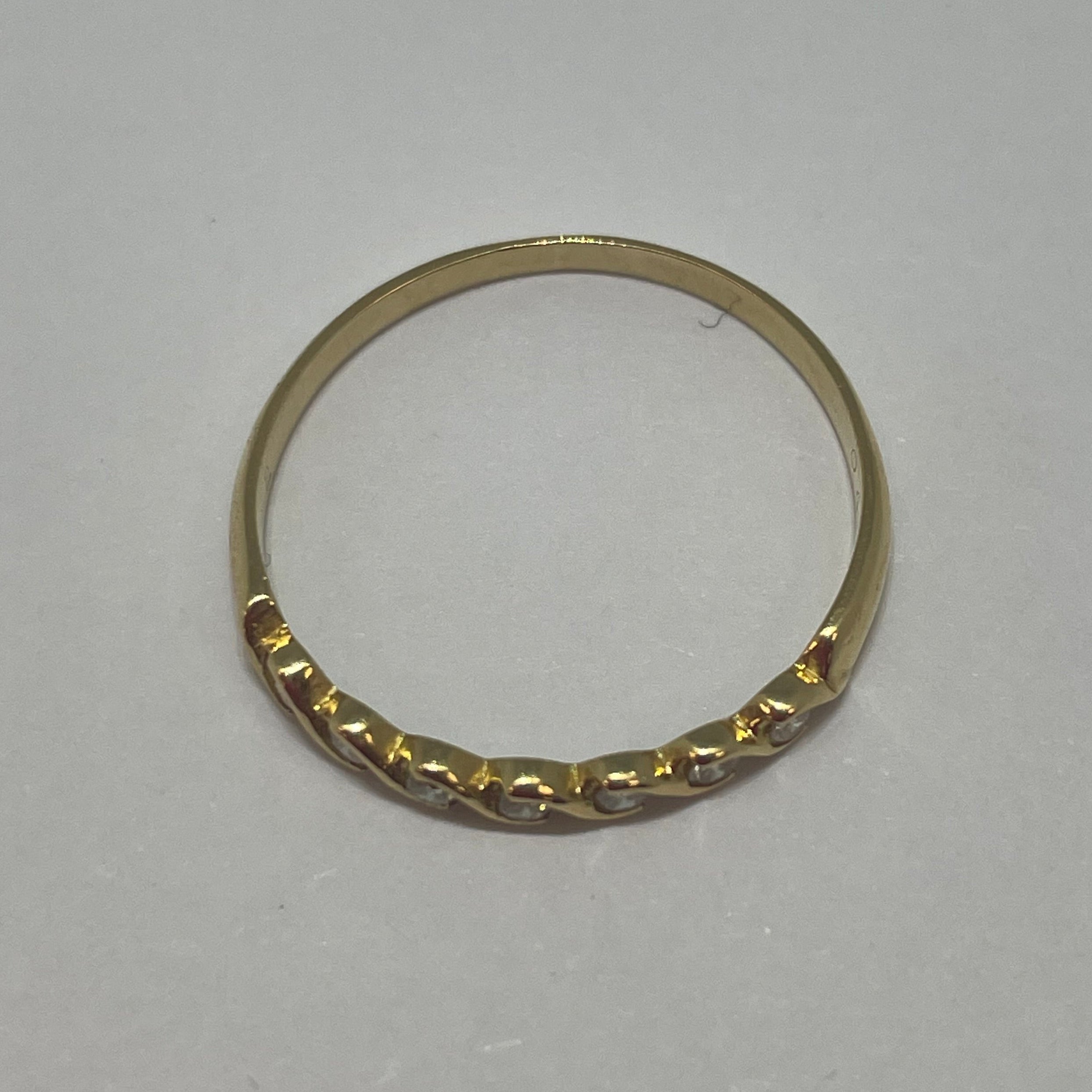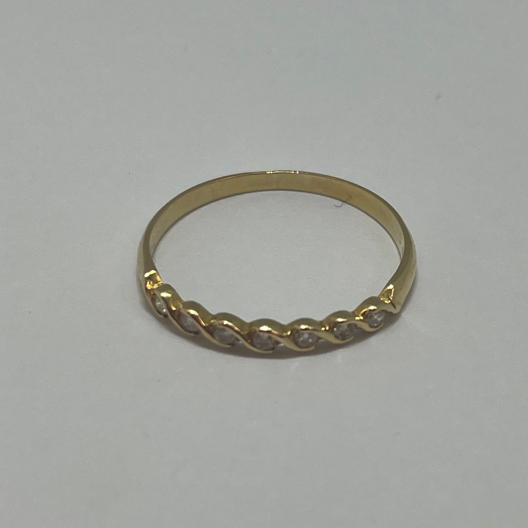 Raffinée bague demi-tour en or jaune 18 carats (750/1000), sertie de 7 diamants étincelants qui lui confèrent une brillance subtile et élégante. Avec un poids de 1,27 g et une taille 54, elle se porte avec légèreté et confort. Poinçonnée Tête d’Aigle, symbole d’authenticité et de qualité française. Un bijou délicat et intemporel en très bon état, idéal pour sublimer la main avec éclat.