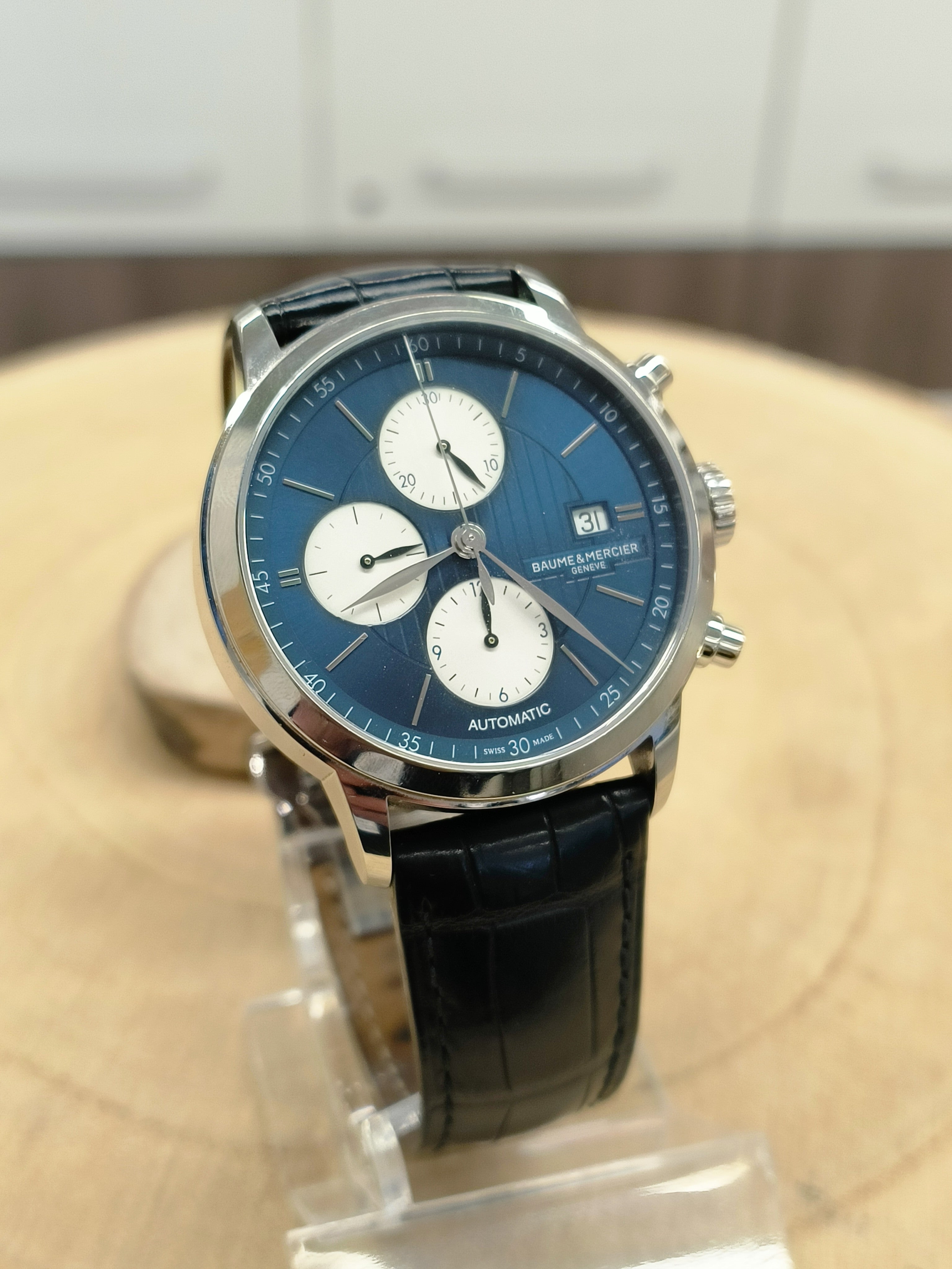 La Classima 10373 de Baume et Mercier est une montre pour homme, dotée d’un boîtier rond de 42 mm en acier poli et d’un mouvement automatique avec fonctions date et chronographe.