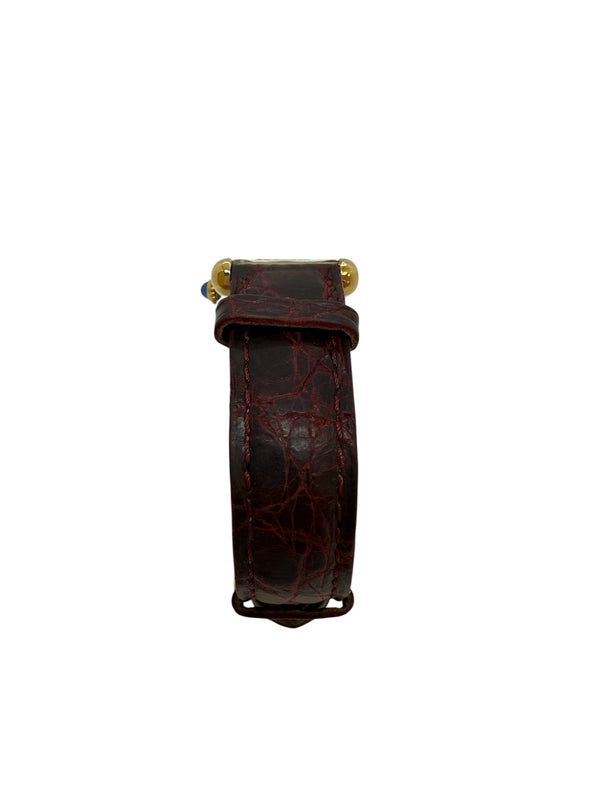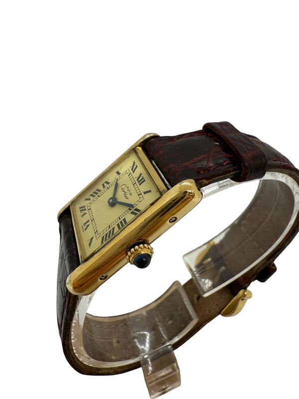 Montre Cartier, modèle Tank Must des années 1980/1990, est en très bon état. De style vintage, elle fonctionne avec un mouvement manuel et un affichage analogique. Son boîtier en vermeil doré mesure 20 mm de diamètre pour 6 mm d’épaisseur, avec un verre acrylique. Elle est montée sur un bracelet en cuir de 14 mm de largeur, fermé par une boucle ardillon, alliant élégance classique et raffinement intemporel.