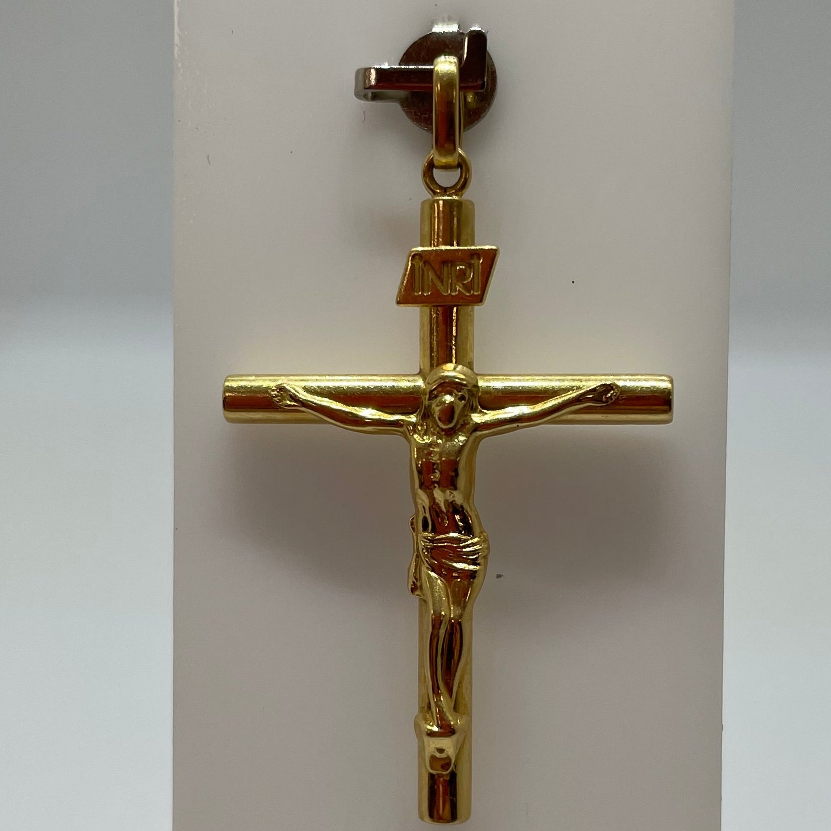 Pendentif croix en or jaune 750/1000 (18K) poinçonné Tête d’Aigle, d’un poids de 1,30 g. Dimensions : 3,5 cm de hauteur, 2,5 cm de largeur et 2 mm d’épaisseur.