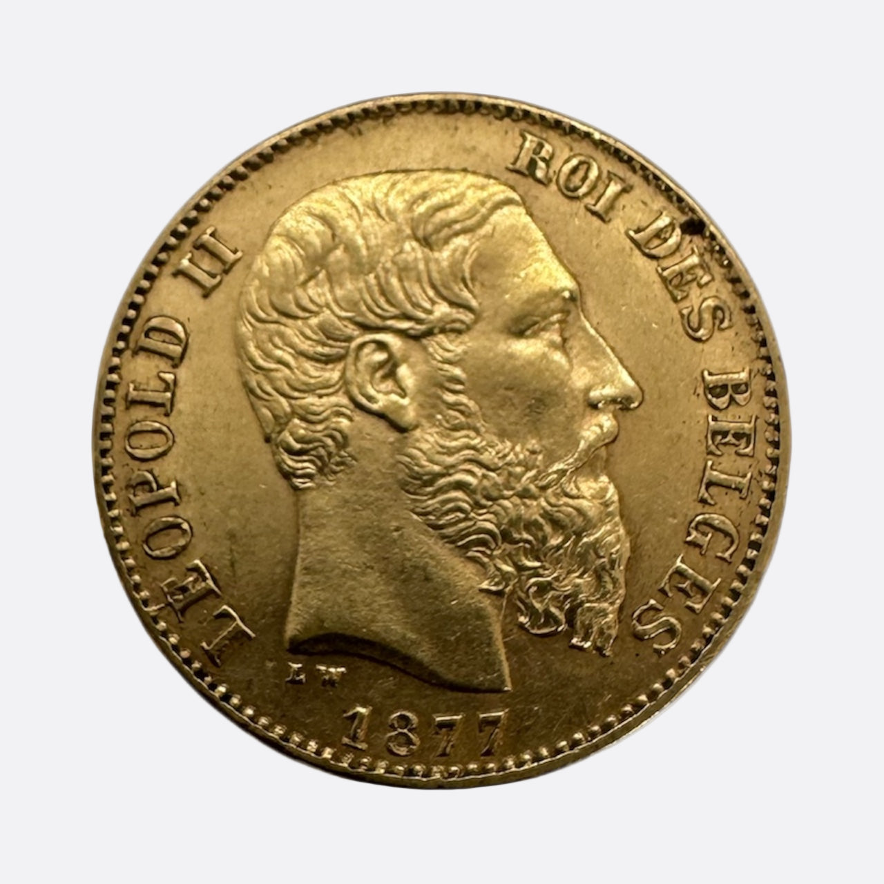 La pièce de 20 Francs Belge Léopold II de 1877 est un exemplaire recherché en or jaune 900/1000 (20 carats). Avec un poids de 6,45 g, un diamètre de 21 mm et une épaisseur de 1 mm, elle présente des reliefs nets et un très bon état .
