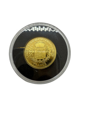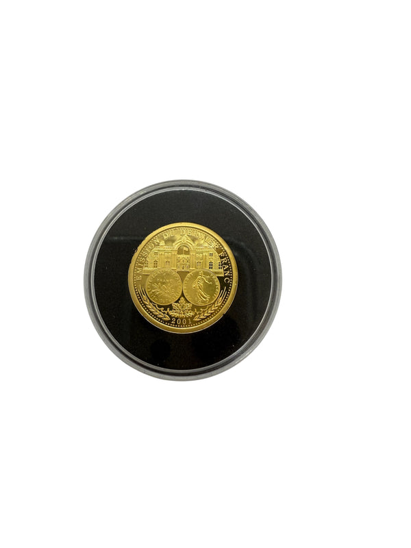 Pièce « Émission du Dernier Franc » de 2001 est réalisée en or jaune 14 carats (585/1000). D’un diamètre de 16 mm, elle présente une épaisseur de 1 mm pour un poids de 2,00 grammes.