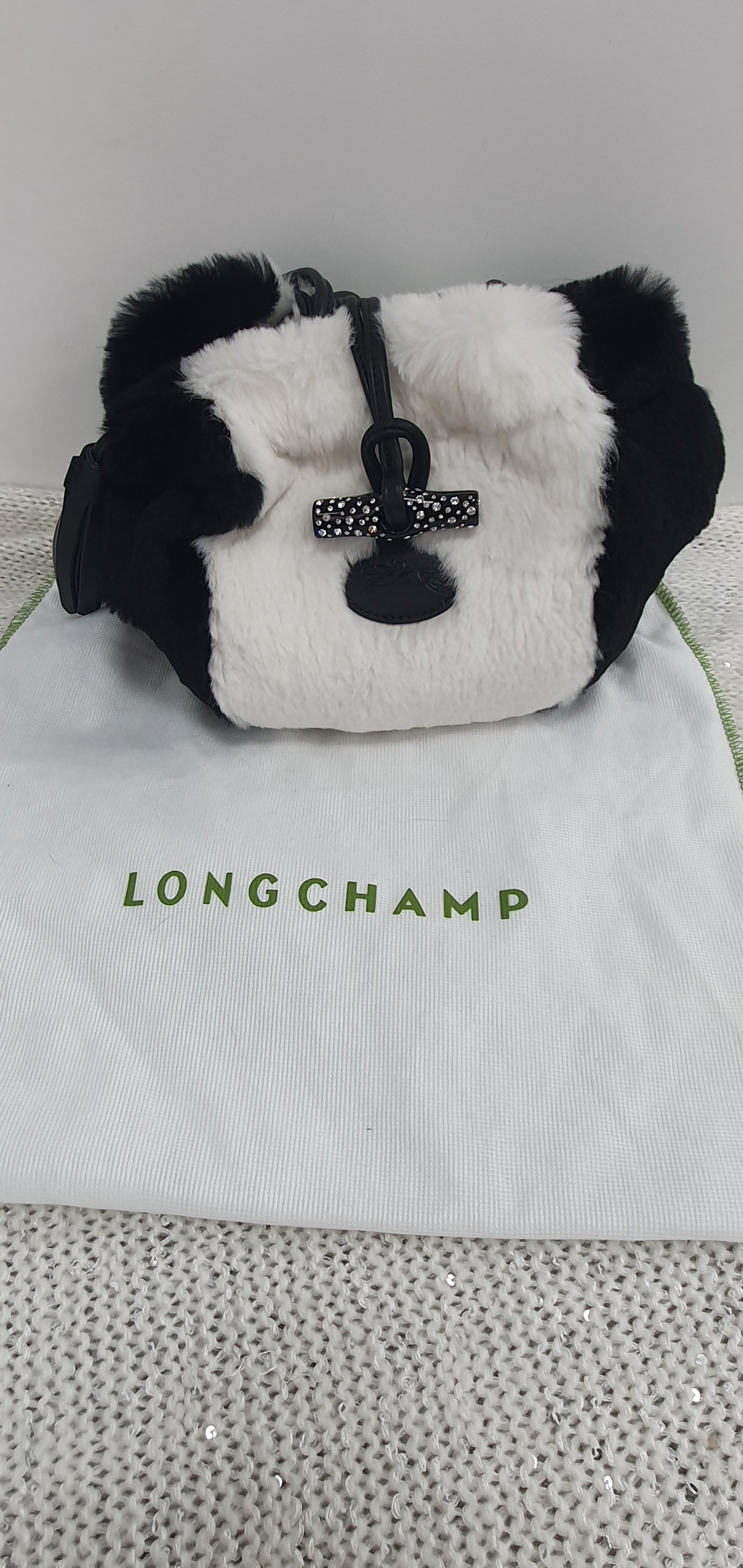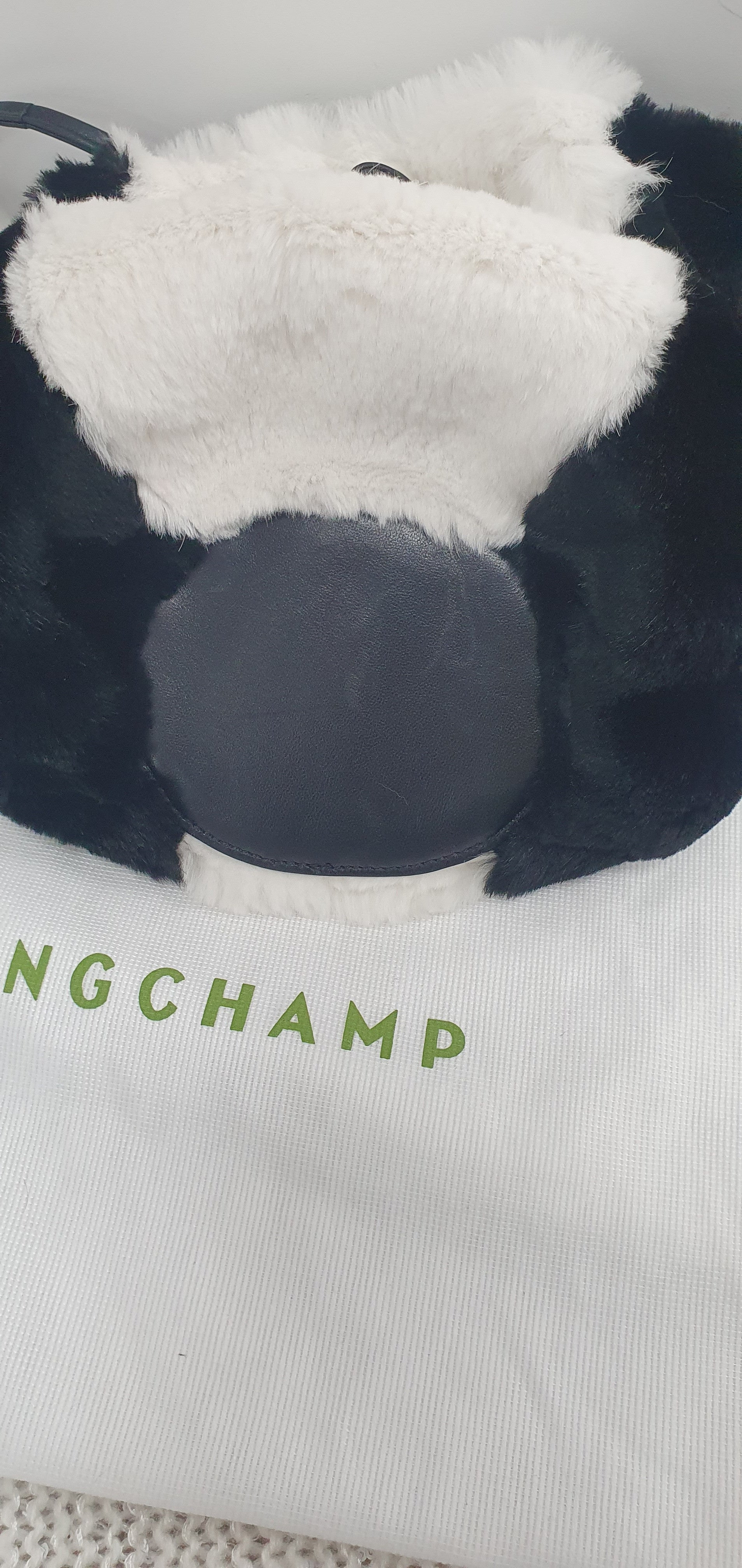 Magnifique sac à main en cuir avec fourrure de lapin noir et blanc. Fermoir en cristaux Swarovski.