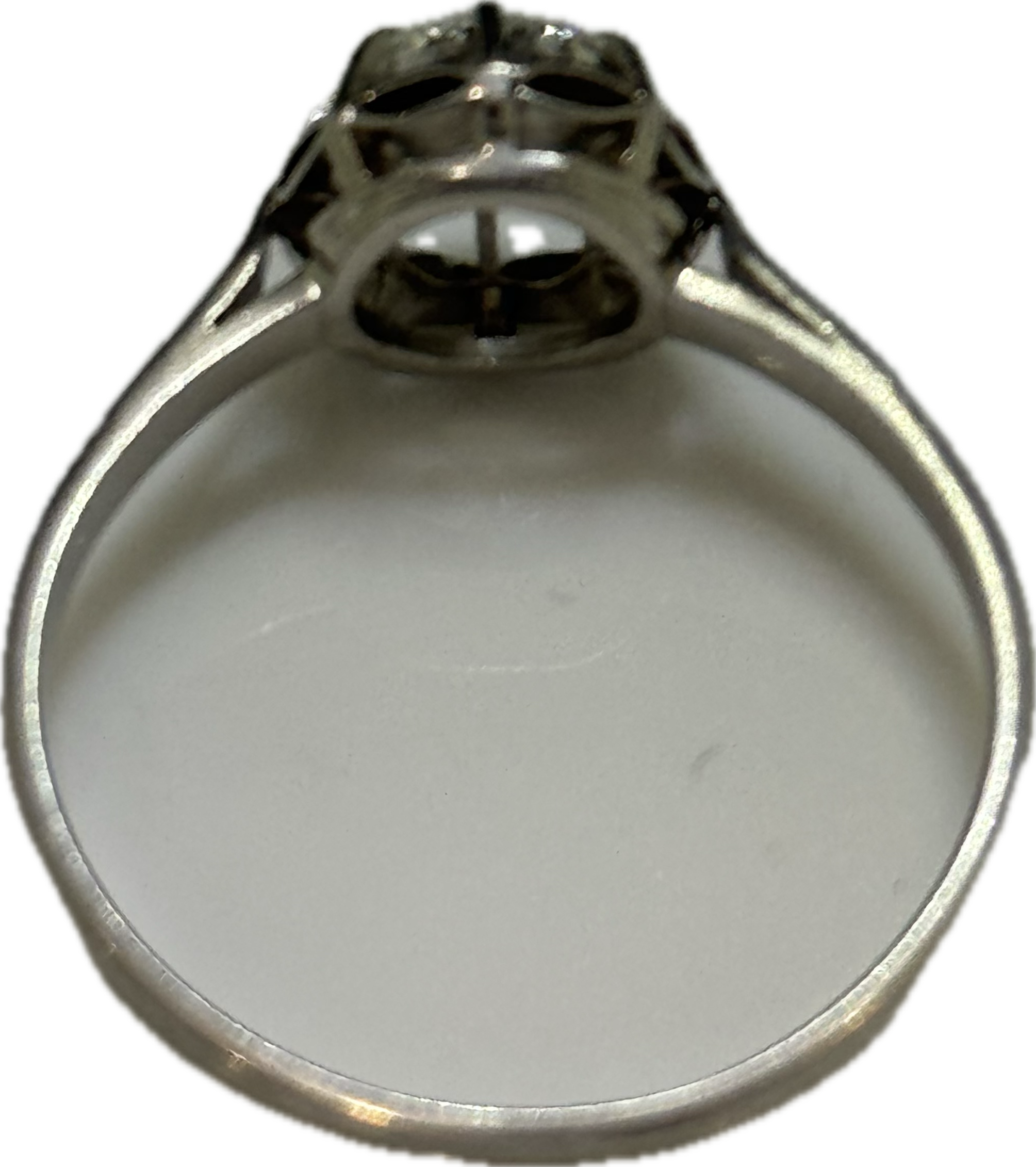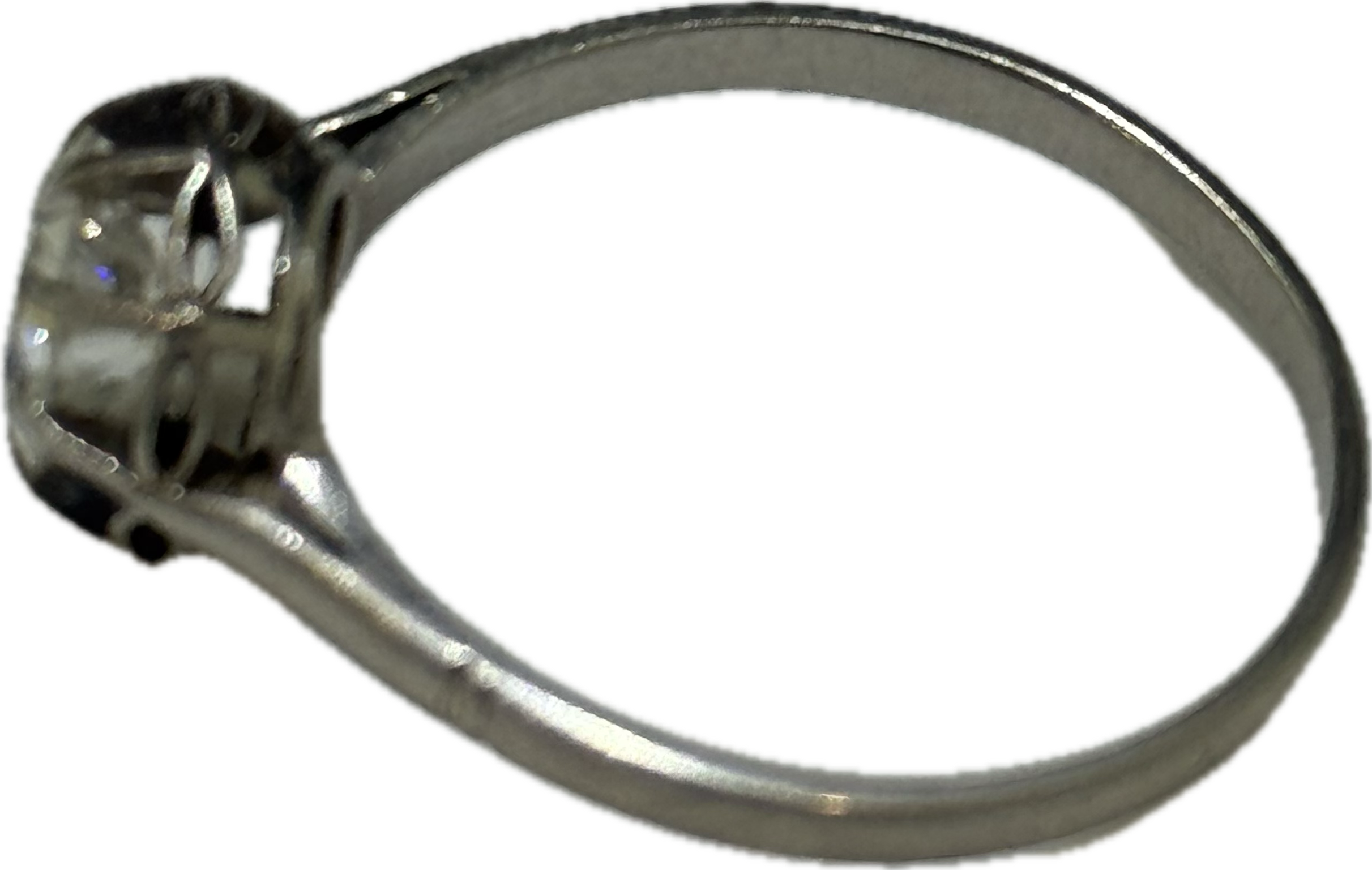 Solitaire en or blanc 18K (poinçon Cygne), poids 4,23 g, taille 53, serti d’un diamant unique. En bon état