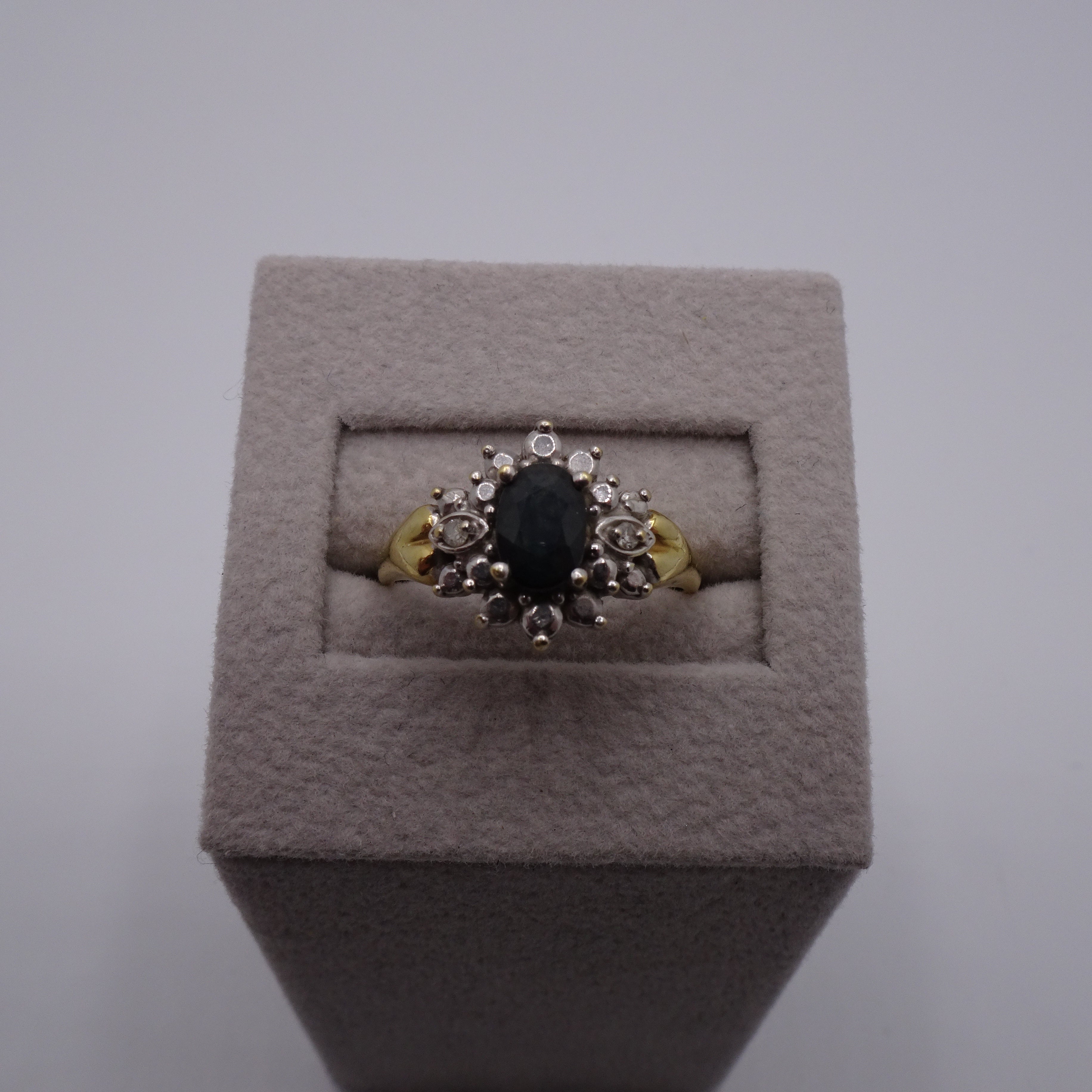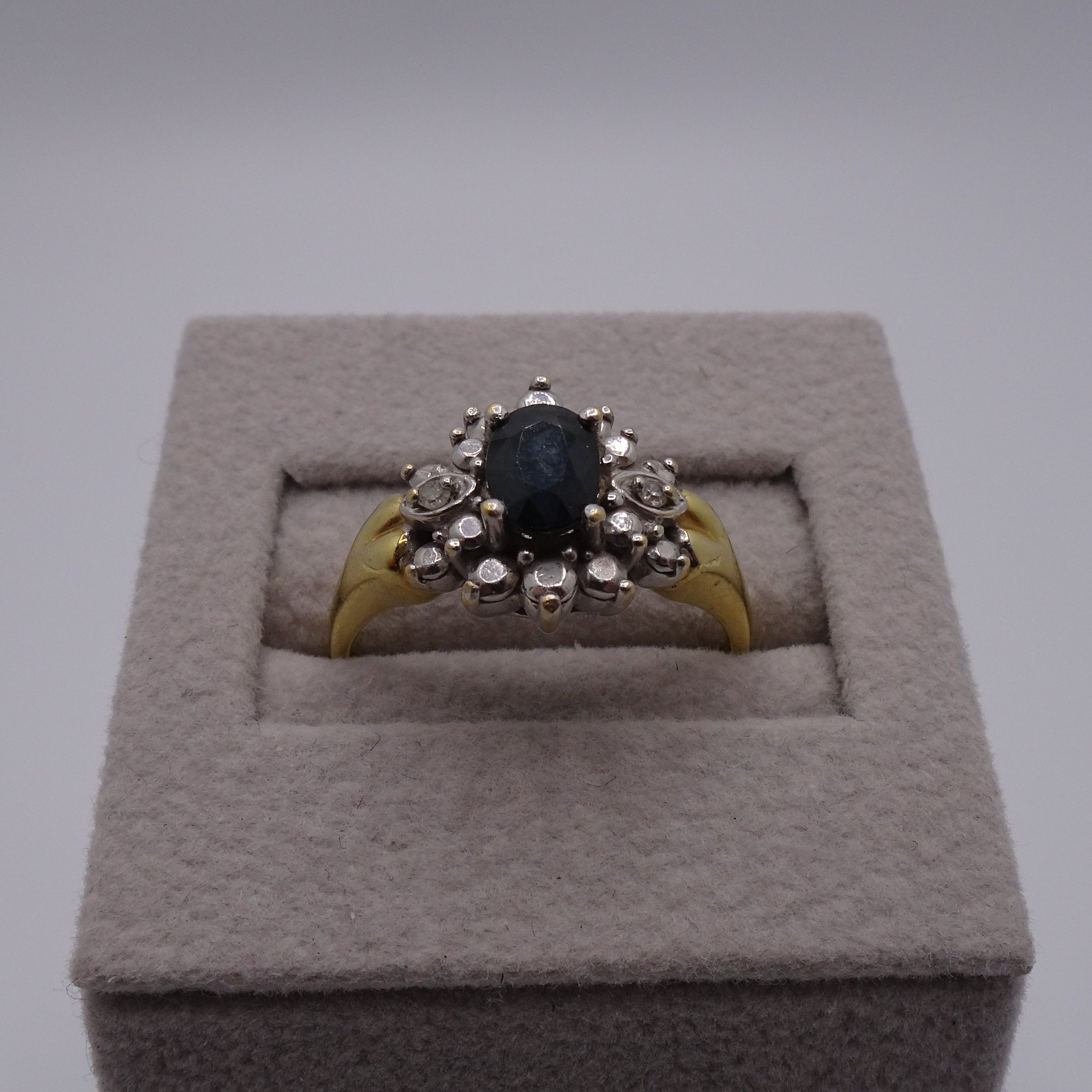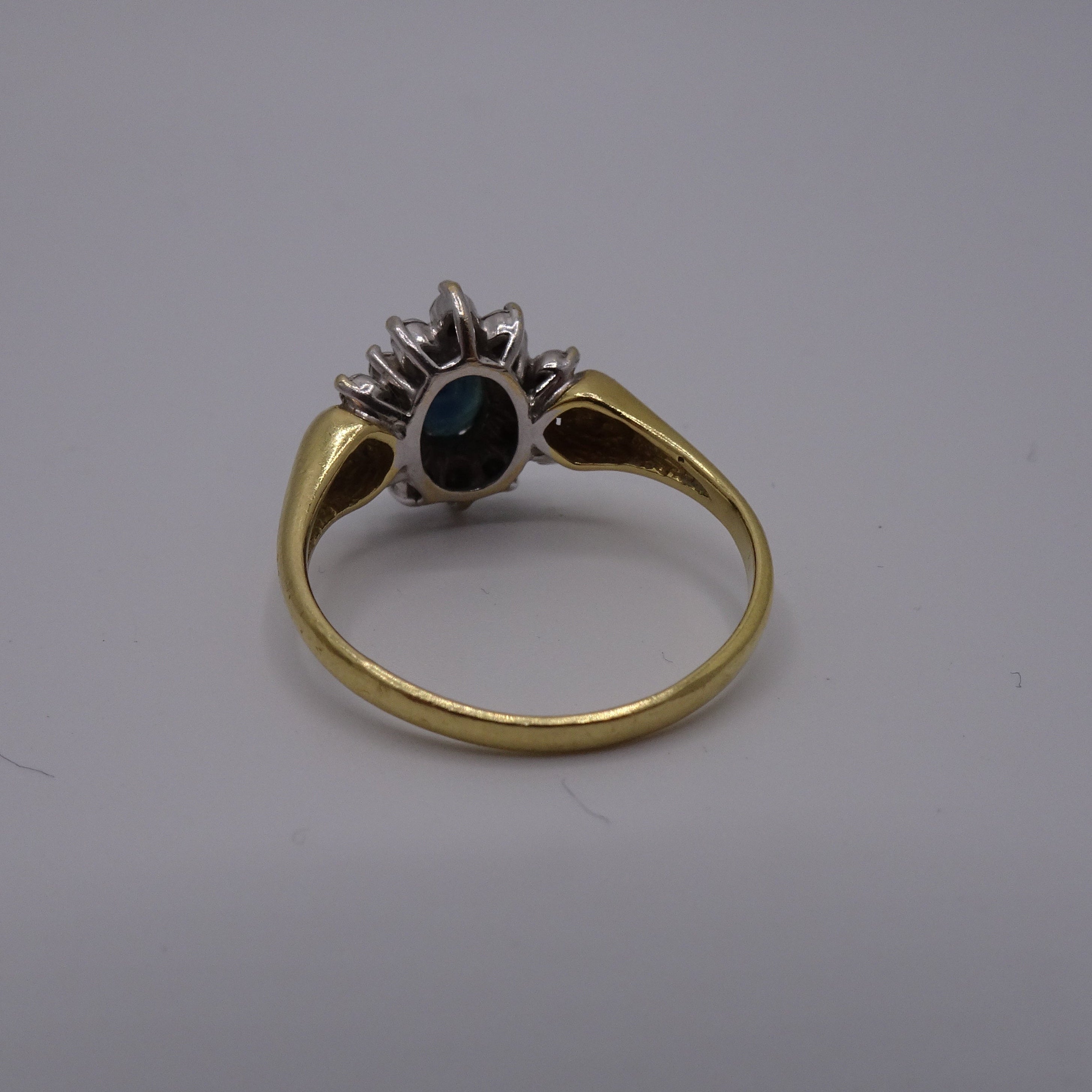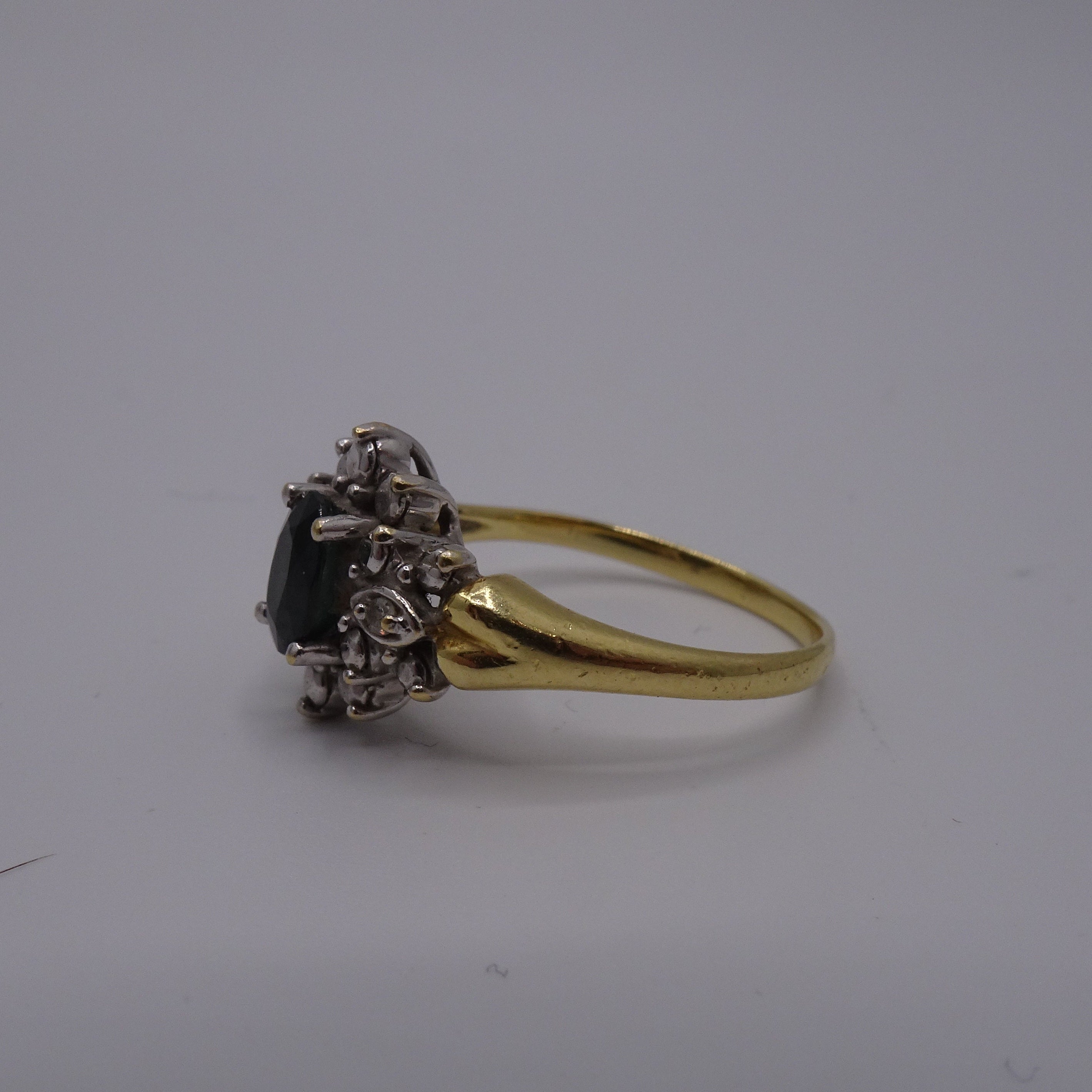 Bague Marguerite en or jaune 750/1000, poinçon Tête d’Aigle, ornée d’un saphir 0.05 ct et de 2 diamants 0.015 ct. Poids 3.61 g, taille 53, état comme neuf.