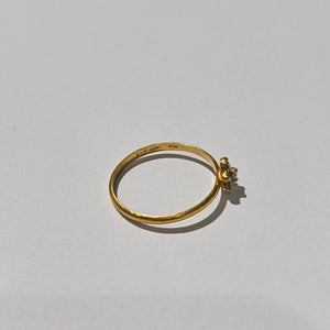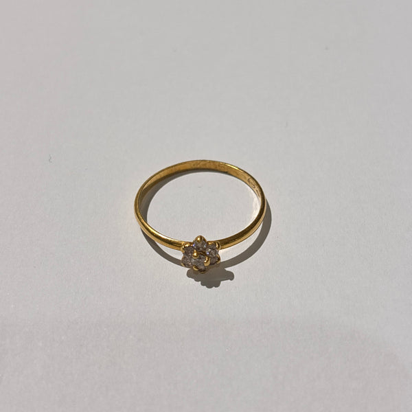 Bague empierrée en or jaune 18 carats (750/1000), poinçonnée "750". Sertie de sept oxydes de zirconium, elle pèse 1,37 gramme et correspond à une taille 56. État comme neuf.