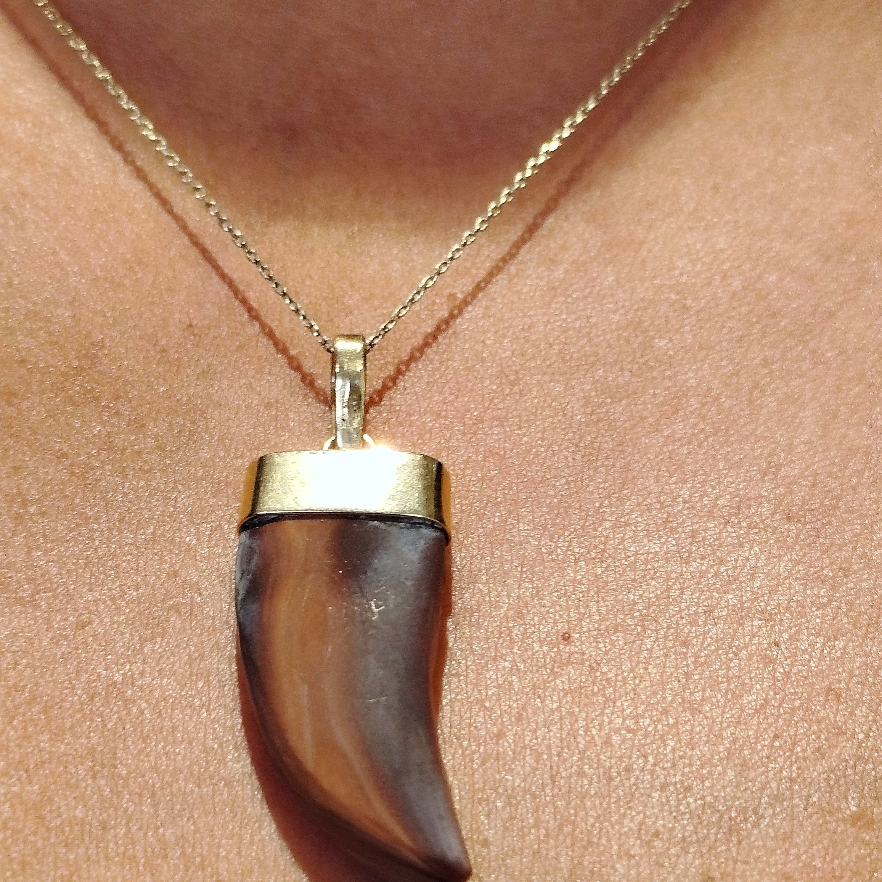 Pendentif dent en or jaune 18 carats, sans poinçon. Hauteur 3 cm, largeur 1,5 cm, épaisseur 0,4 cm, poids 5,95 g, sans pierres, en bon état.