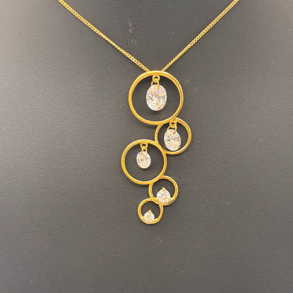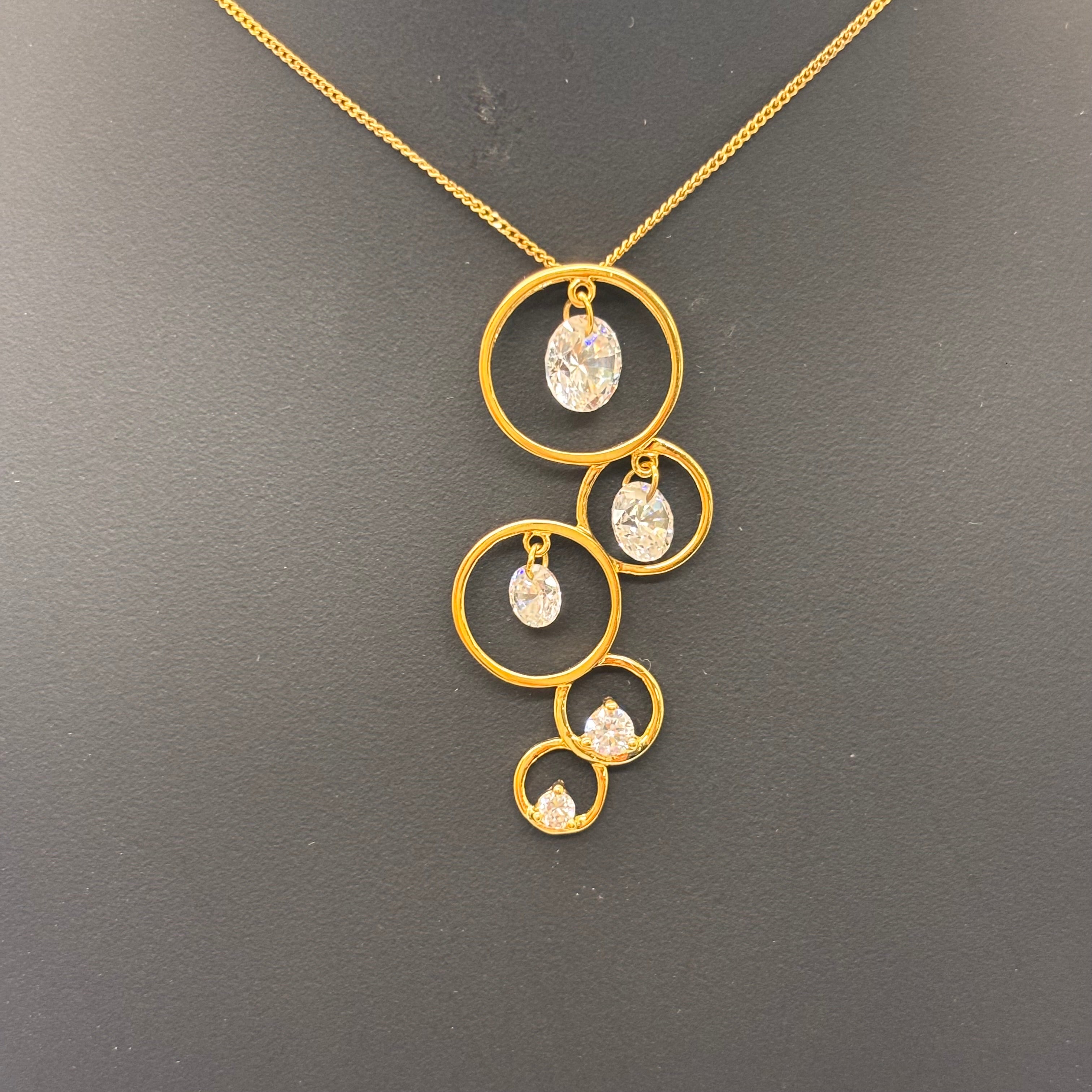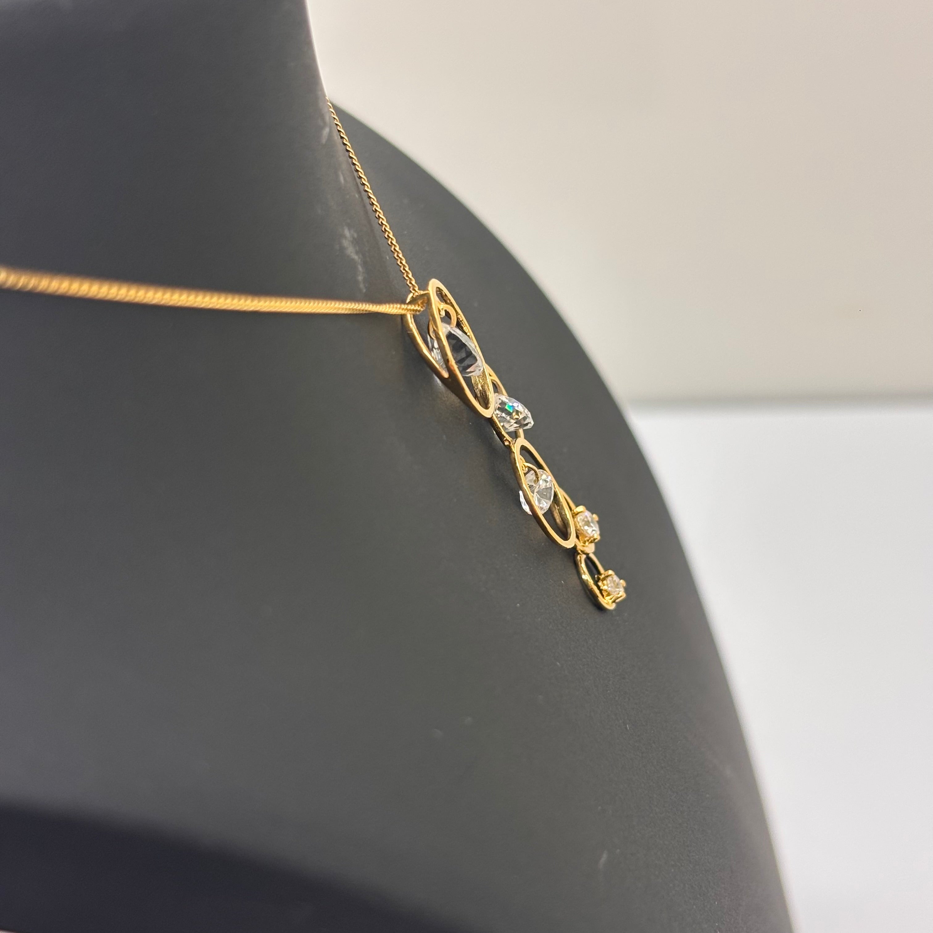 Pendentif en or jaune 18 carats (750/1000), orné de 5 oxydes de zirconium. Dimensions : 3,5 cm de hauteur, 1 cm de largeur, 1 mm d’épaisseur, poids : 1,94 g, état : bon. Un bijou discret et élégant, parfait pour un porté quotidien ou pour compléter une chaîne fine.