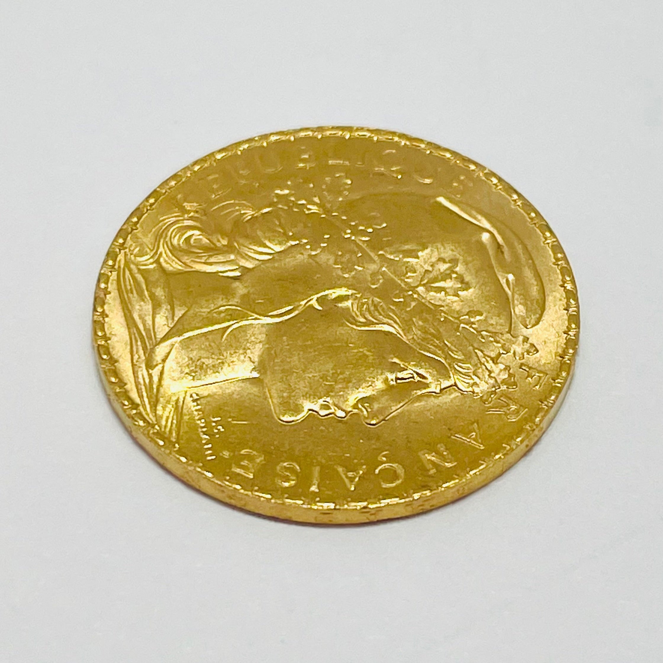 Pièce de 20 Francs Coq Marianne en or jaune, année 1909, titrée 900/1000 (20 carats), en état comme neuve. D’un poids de 6,47 g, elle présente un format classique (2 cm x 2 cm, épaisseur 1 mm). Pièce emblématique de l’histoire monétaire française, appréciée pour la pureté de son or et son fort potentiel patrimonial.