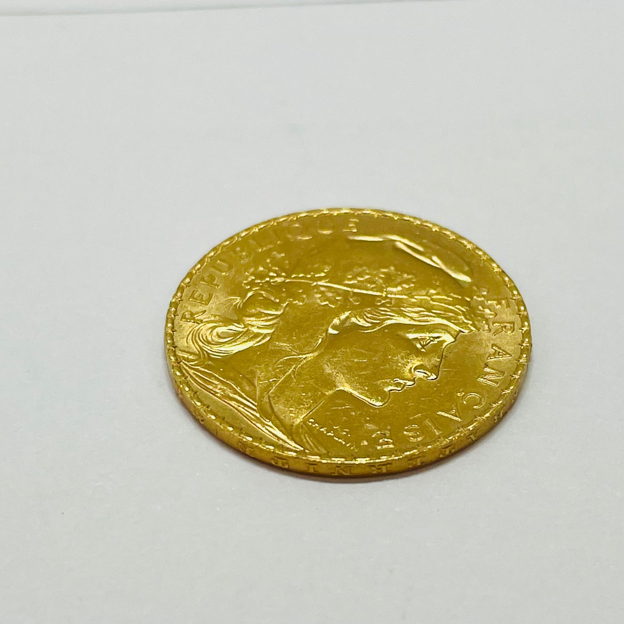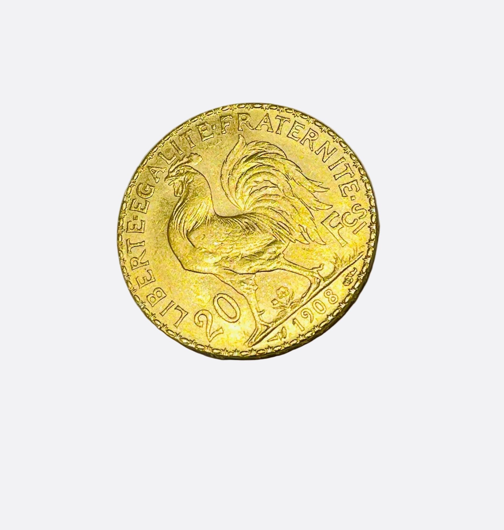 Pièce 20 Francs Coq Marianne en or jaune 900/1000 (20 carats), émise en 1908. D’un poids de 6,45 g et d’un diamètre de 2 cm, elle est en état comme neuf. Une pièce emblématique, appréciée pour son authenticité et sa forte valeur en or.