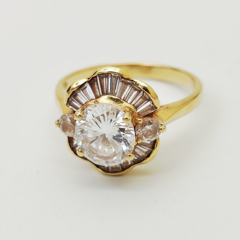 Bague empierrée en or jaune 18 carats (750/1000), poinçonnée Tête d’Aigle, sertie d’oxydes de zirconium. 4,92 g, taille 54, en bon état. Bijou en or massif, élégant et lumineux.