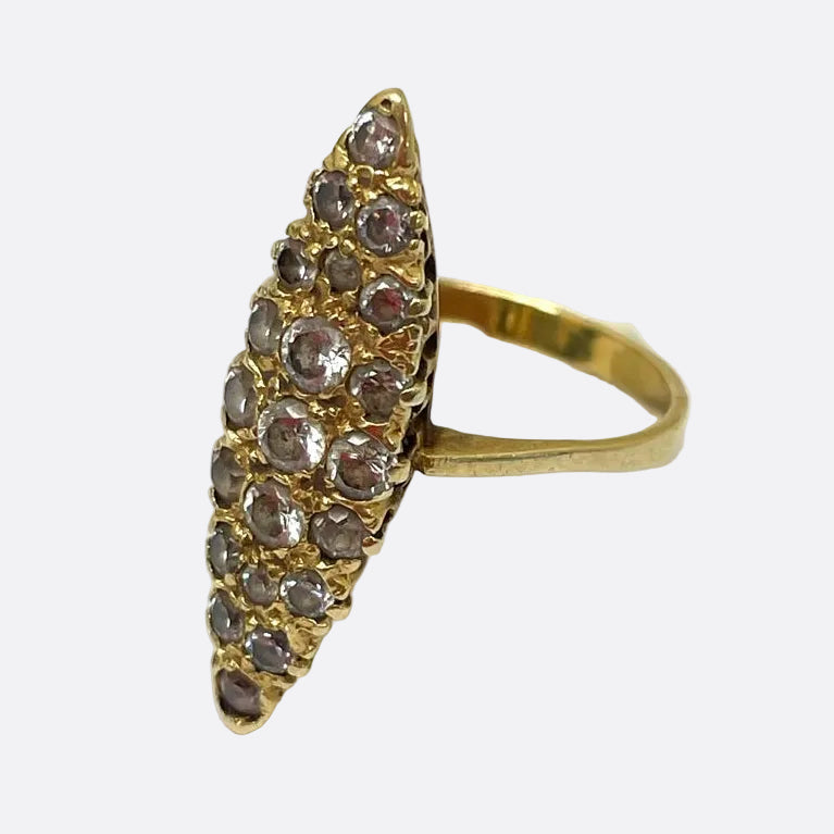Cette bague marquise en or jaune 18 carats (750/1000) est sertie de 21 oxydes de zirconium offrant un bel éclat. Poinçonnée tête d’aigle, d’un poids de 4,10 g et en taille 53, elle est proposée en très bon état. Un bijou élégant et intemporel, idéal à porter ou à offrir.