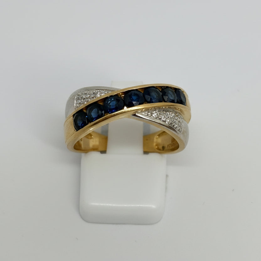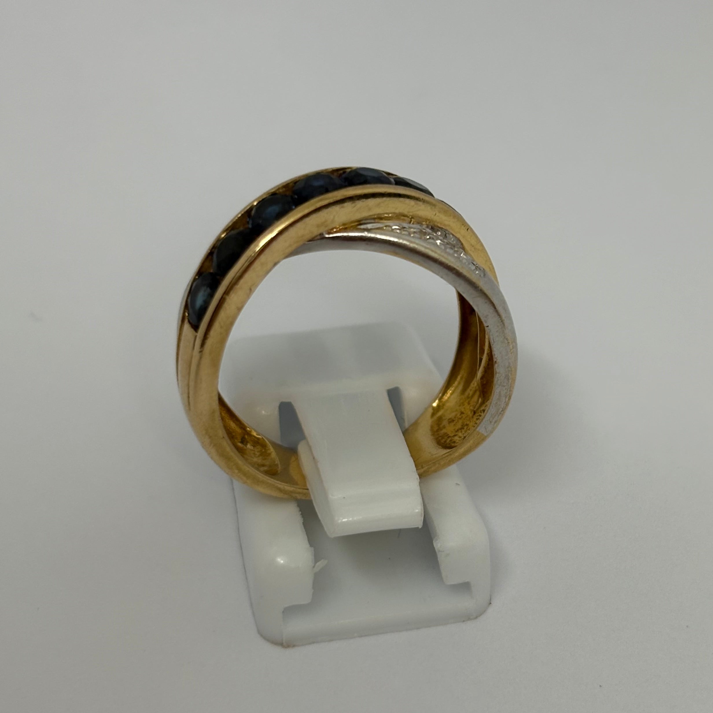 Élégante bague empierrée en or jaune et or gris 18 carats (750/1000), sertie de 4 diamants et 7 saphirs pour un éclat raffiné. Poinçon tête d’aigle, poids 5,67 g, taille 54, en très bon état. Un bijou intemporel, idéal pour toutes les occasions.