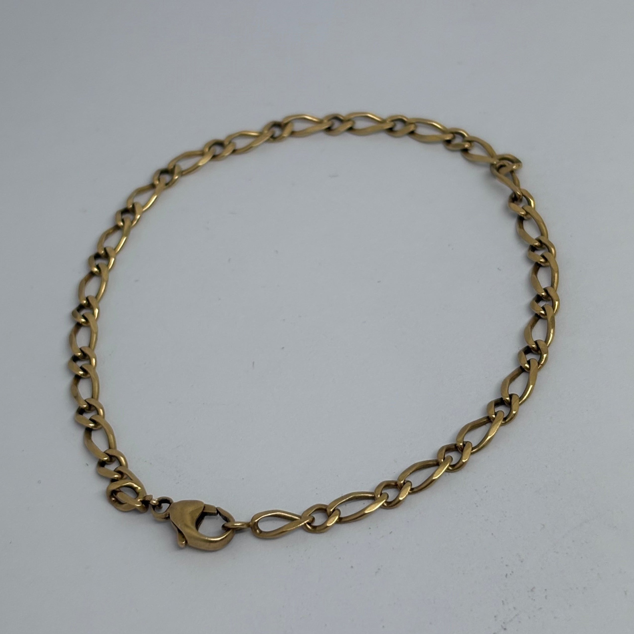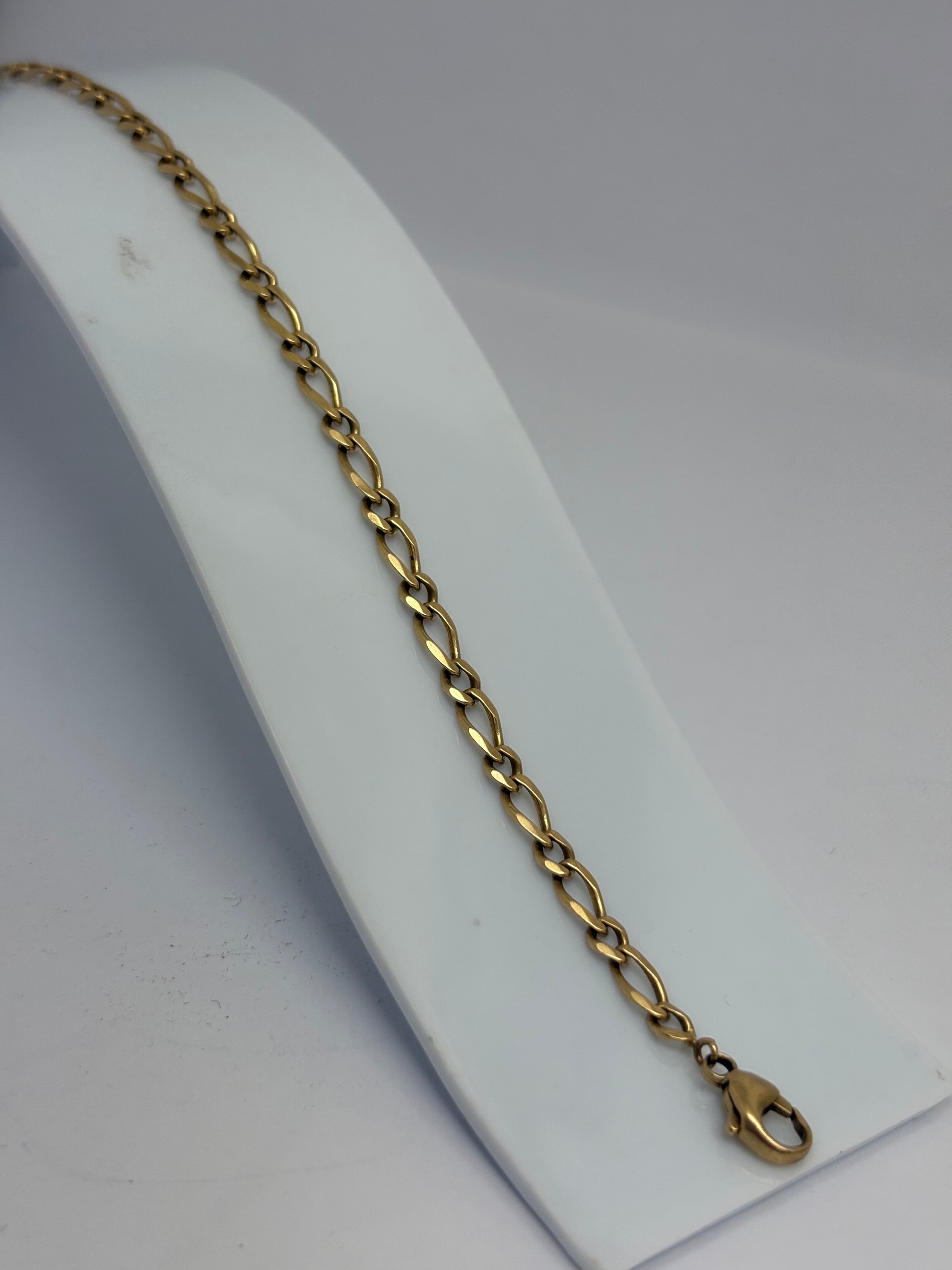 Bracelet maillon Figaro en or jaune 18 carats (750/1000), poinçonné Tête d’Aigle 750, reconnu pour sa solidité et son style intemporel. D’un poids de 6,52 g, il mesure 22 cm de longueur pour 4 mm de largeur et 1 mm d’épaisseur. Équipé d’un fermoir mousqueton sécurisé, ce bracelet en bon état.