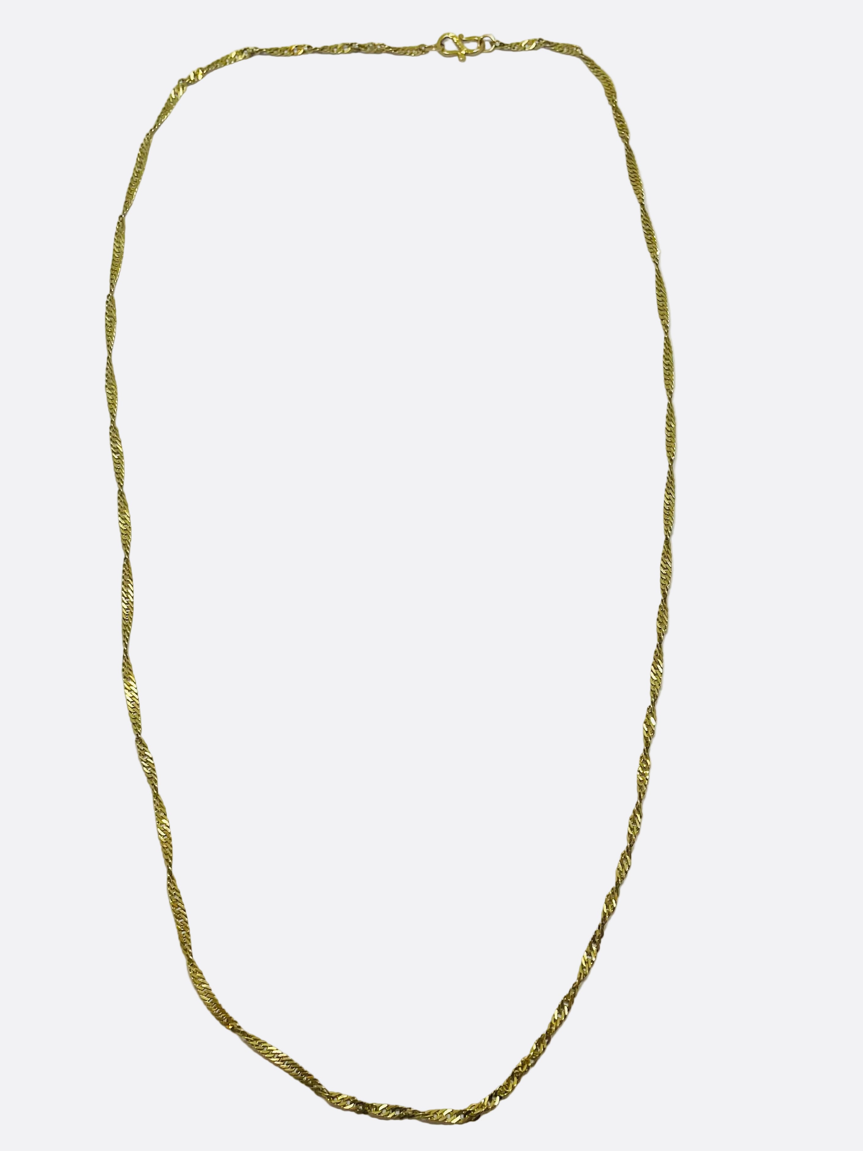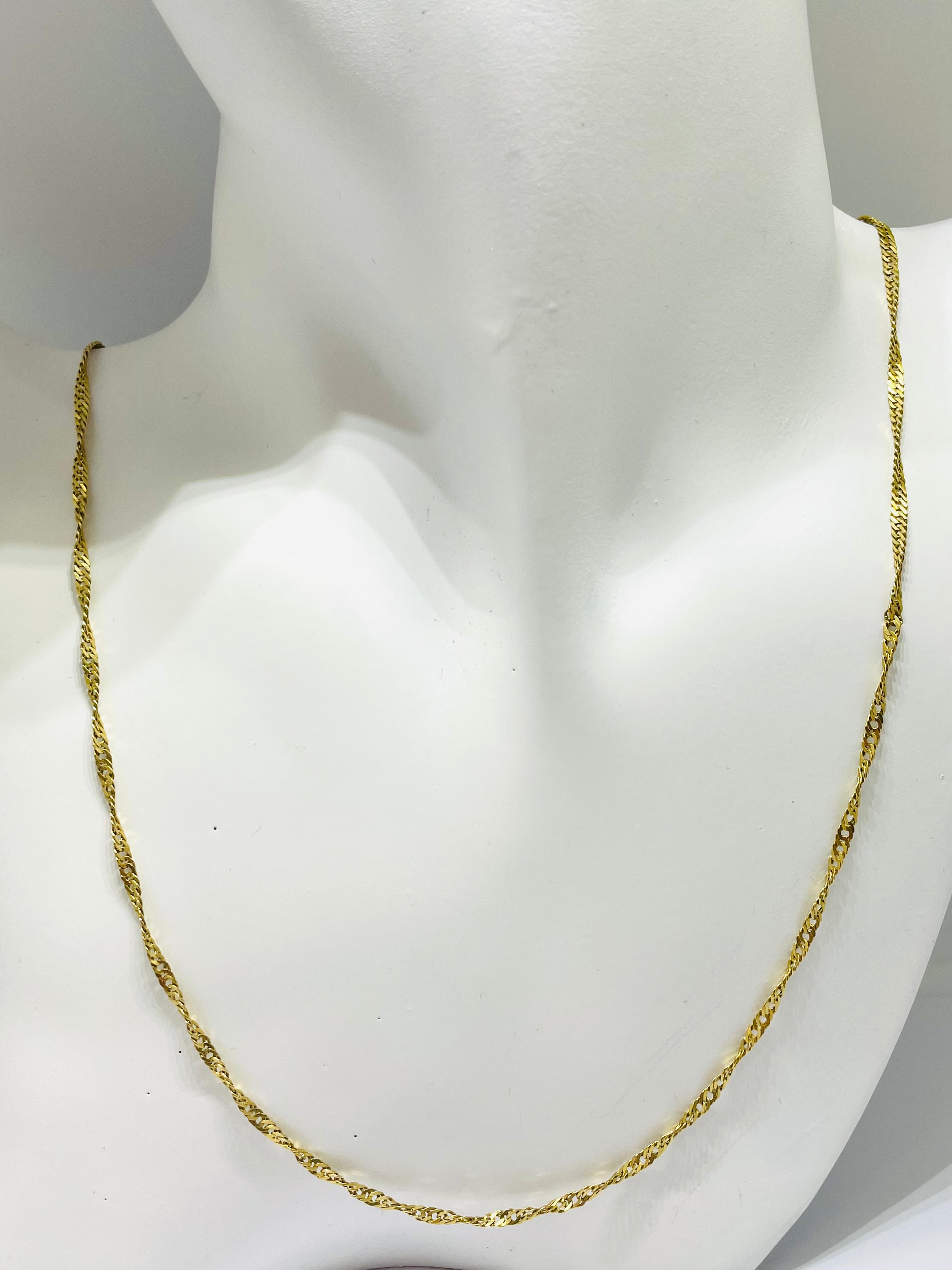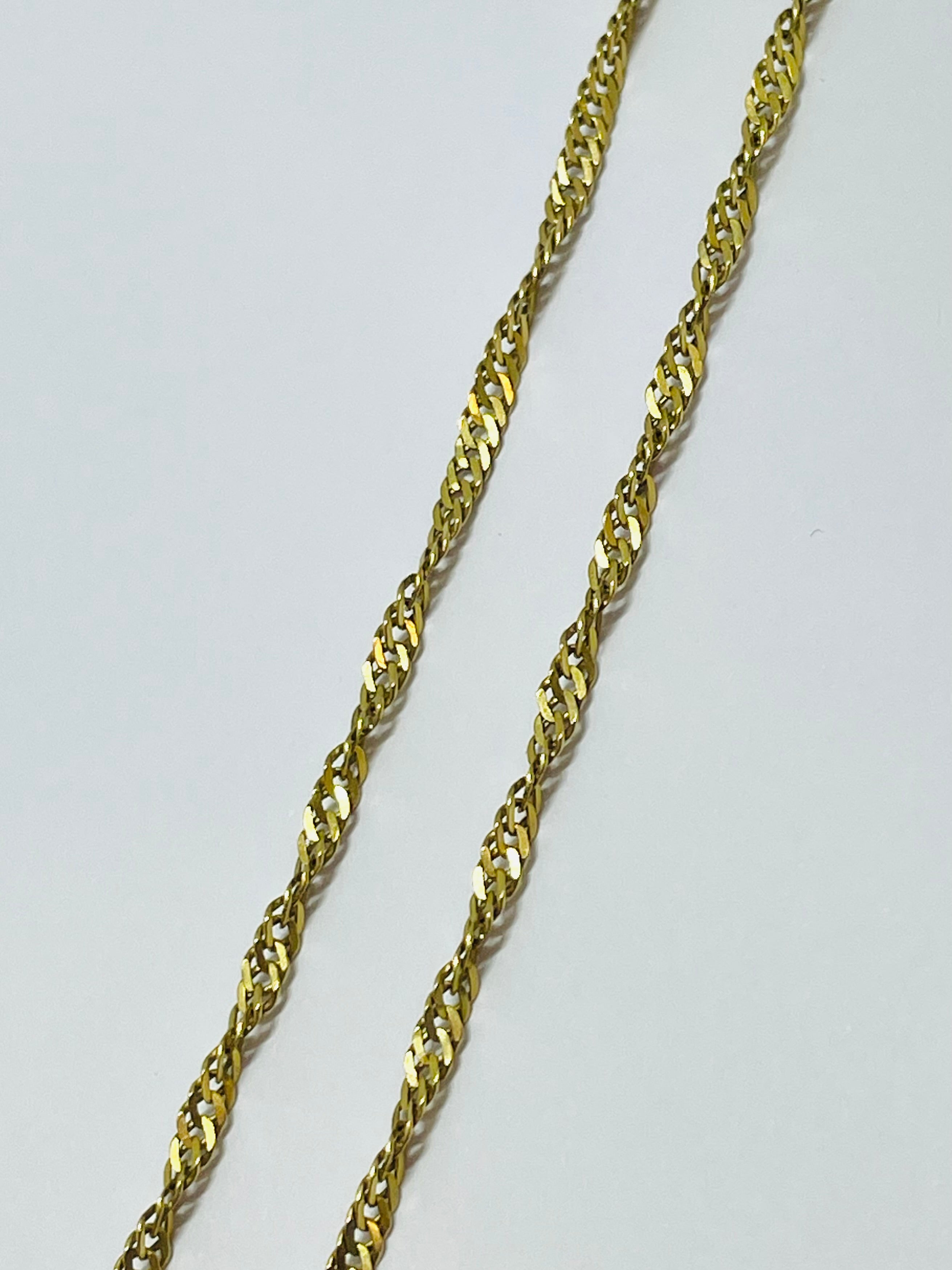 Chaîne en or jaune 875/1000 à maille torsadée, élégante et résistante. Avec une longueur de 58,5 cm, une épaisseur de 2 mm et un poids de 6,12 g, elle offre une belle présence tout en restant confortable.