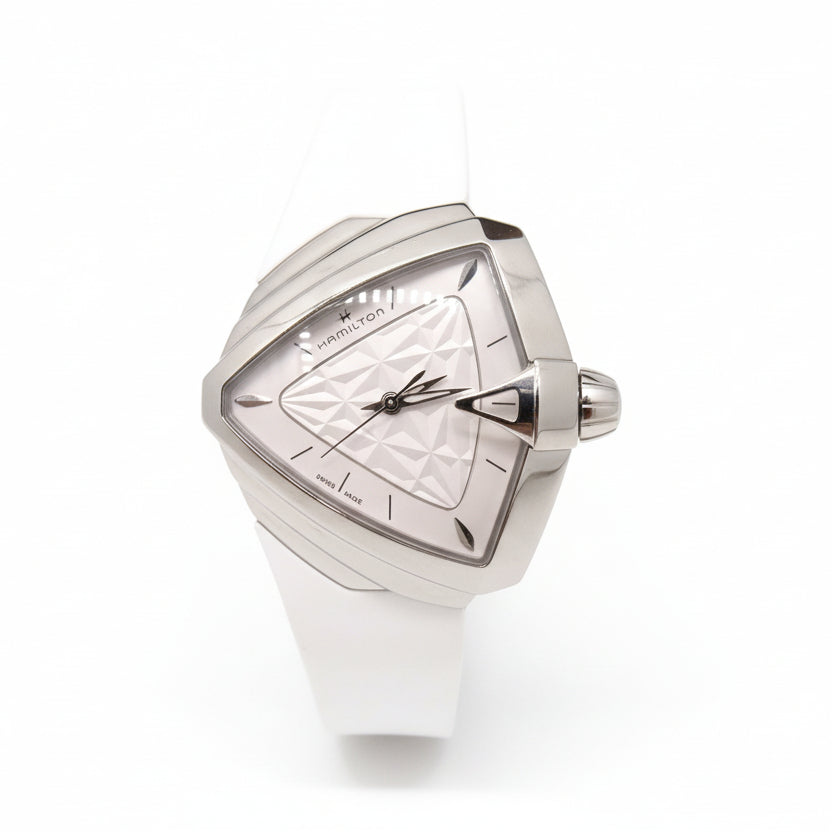 Montre Hamilton Ventura S Quartz (2023) avec mouvement quartz précis, boîtier en acier gris de 4,1 cm et verre saphir résistant aux rayures. Son bracelet en caoutchouc avec boucle ardillon assure confort et style au quotidien.