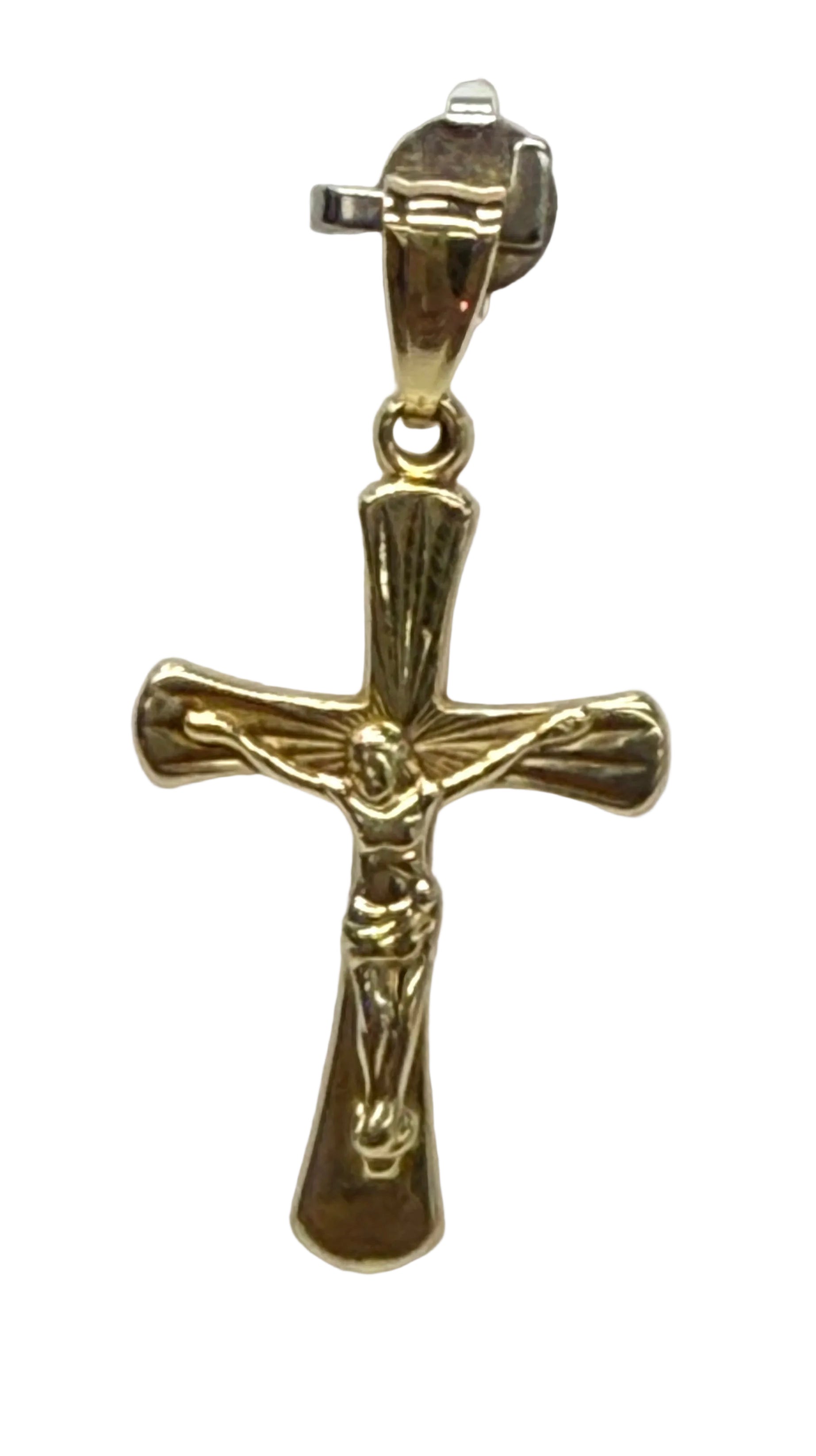 Croix en or jaune 18 carats, poinçonnée 750, fine et élégante. Dimensions 3,2 × 1,6 cm, poids 1,31 g. État comme neuf.