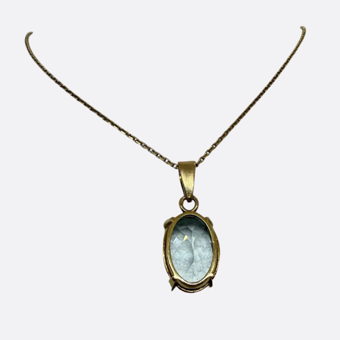 Pendentif solitaire en or jaune 18 carats (750/1000), poids 5,49 g, dimensions 18 x 12 x 7 mm. Sertie d’une aigue-marine ovale de 10 carats, il offre un éclat unique.