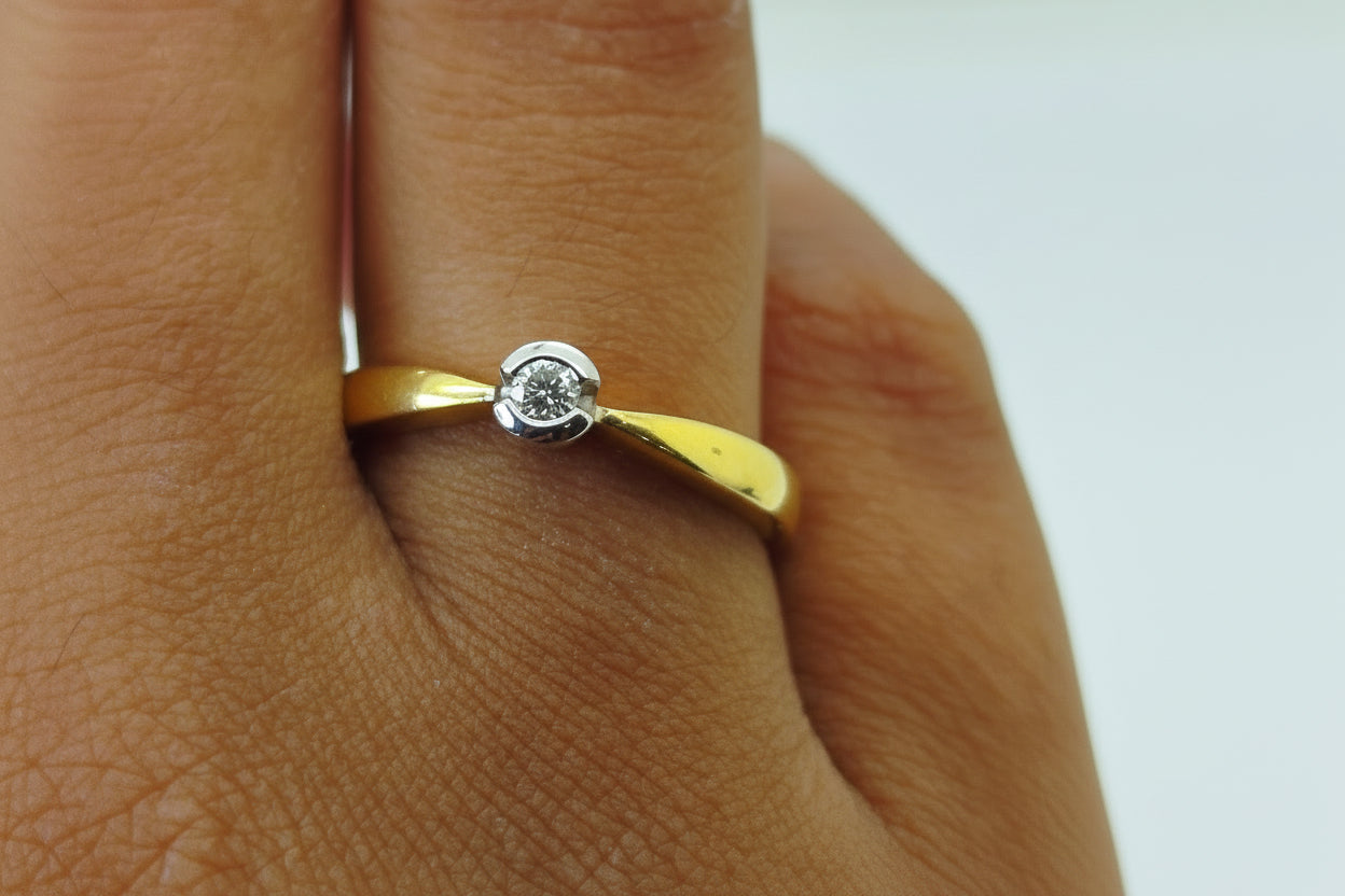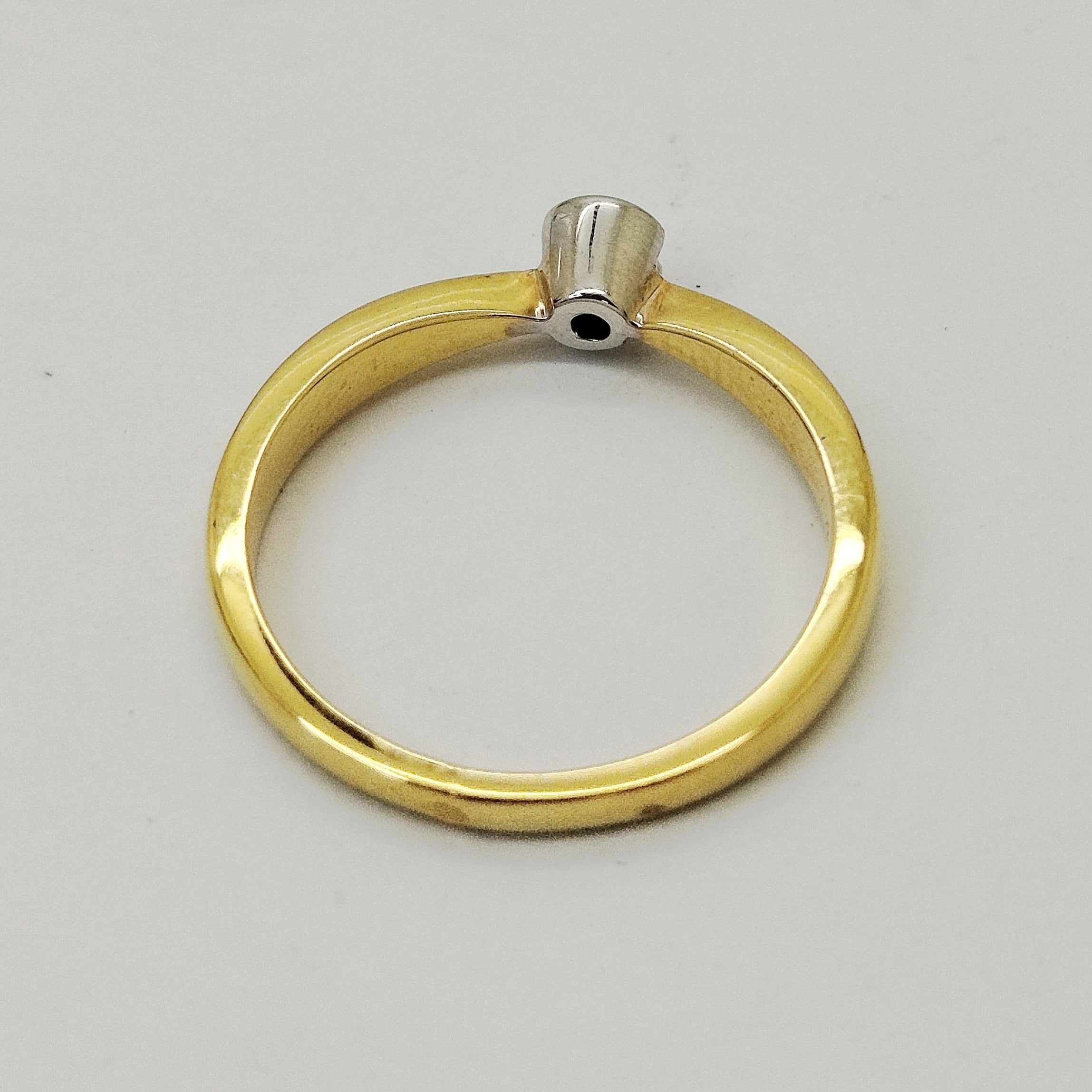Bague solitaire bicolore en or jaune et or blanc 18 carats (750/1000), poinçonnée Tête d’Aigle, sertie d’un diamant éclatant. Avec un poids de 3,10 g, elle offre un porté élégant et confortable. En taille 54 et en très bon état, ce solitaire allie raffinement classique et modernité grâce à son jeu de deux ors.