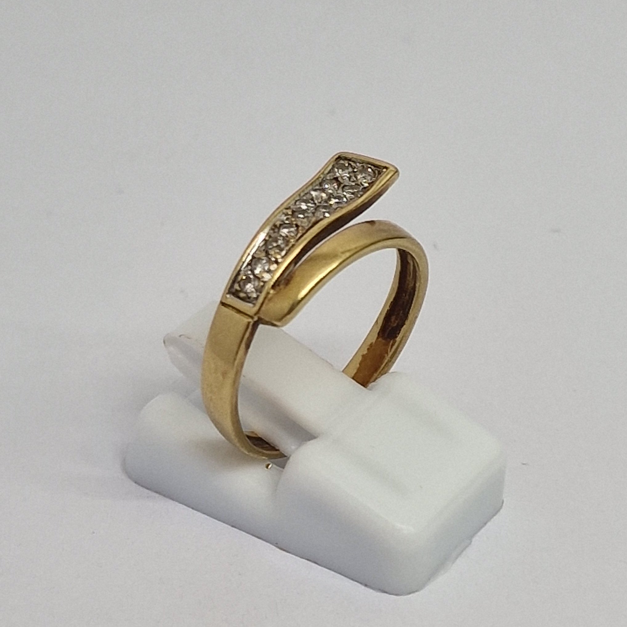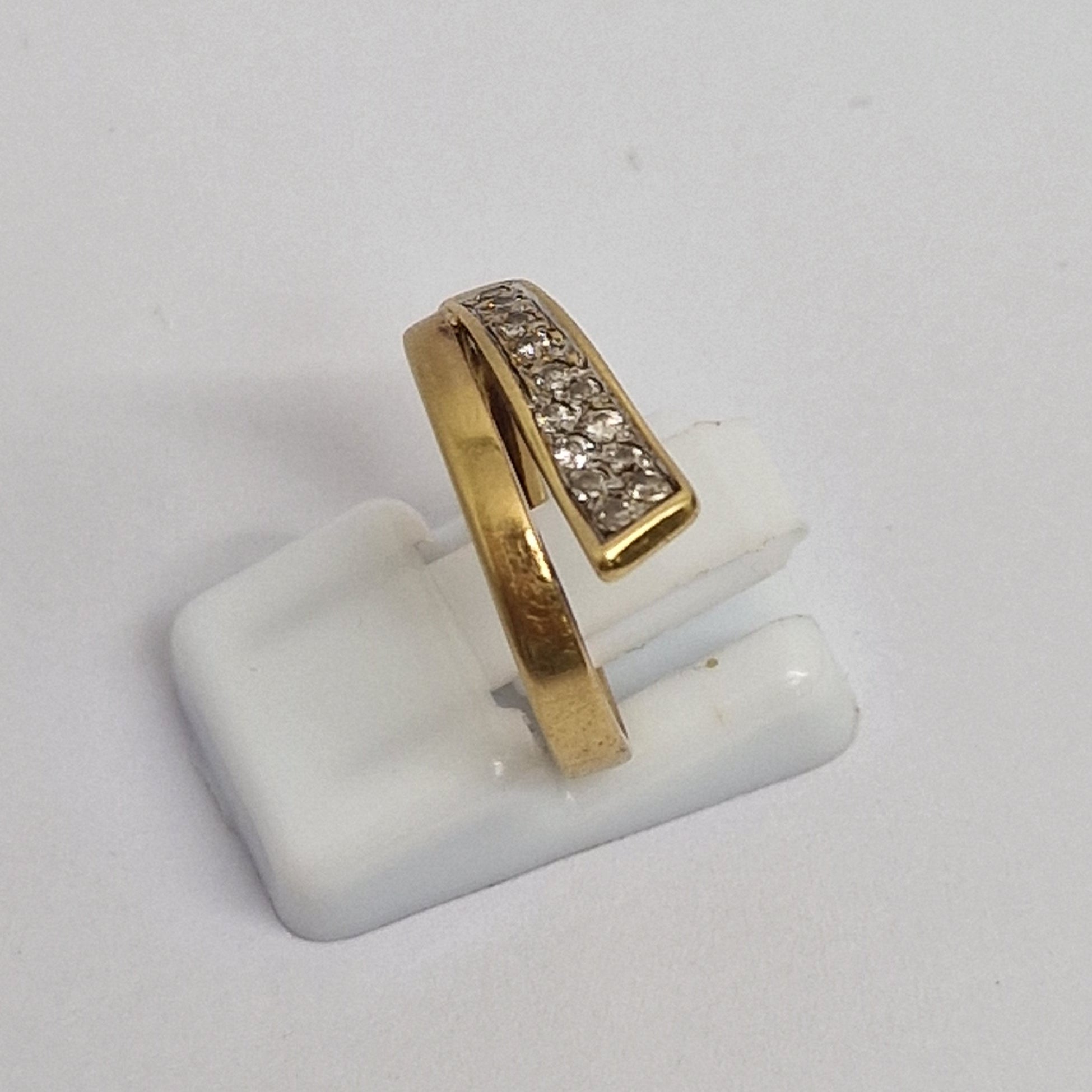 Bague demi-tour en or jaune 18 carats (750/1000), poinçon Tête d’Aigle, poids 2,89 g, taille 53. Sertie de diamants, elle allie élégance et brillance. En très bon état.