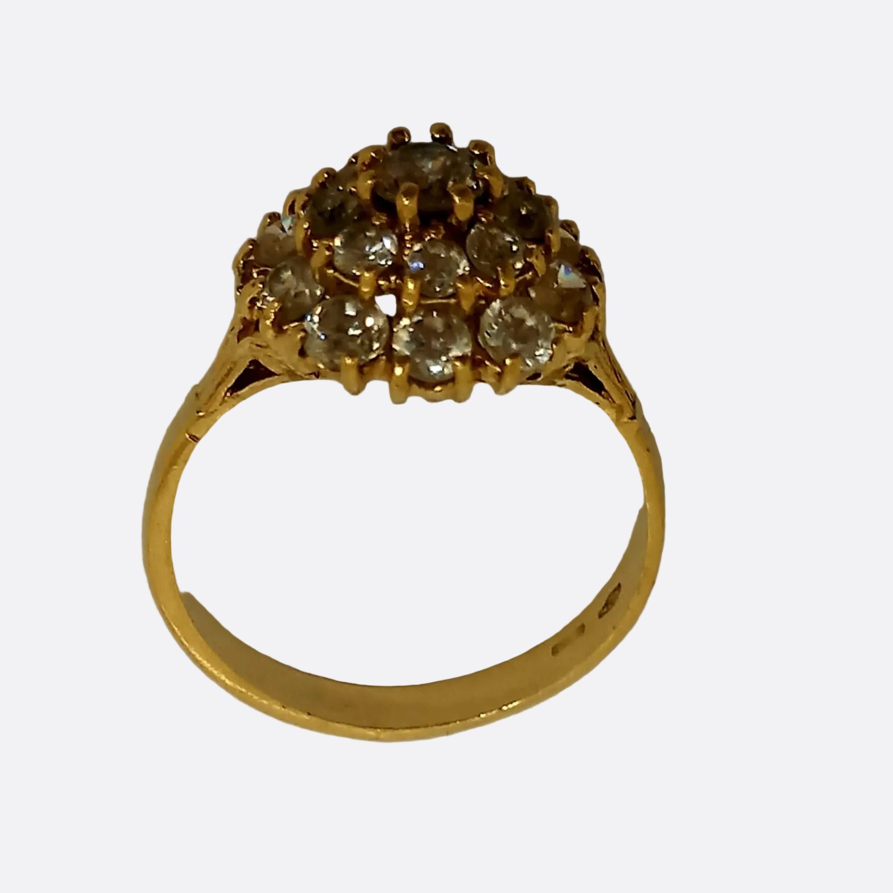 Bague empierrée de type "Chou" en or jaune 18 carats (poinçon 750), sertie de 19 oxydes de zirconium pour un éclat délicat et élégant. Avec un poids de 4,16 g et une taille 55, elle offre un design raffiné, parfait pour un porté quotidien ou une occasion spéciale. Proposée en très bon état, cette bague allie finesse et brillance subtile.