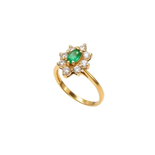 Bague marguerite en or jaune 18 carats (750/1000), poinçonnée Tête d’Aigle, ornée d’une émeraude centrale entourée de zirconiums.