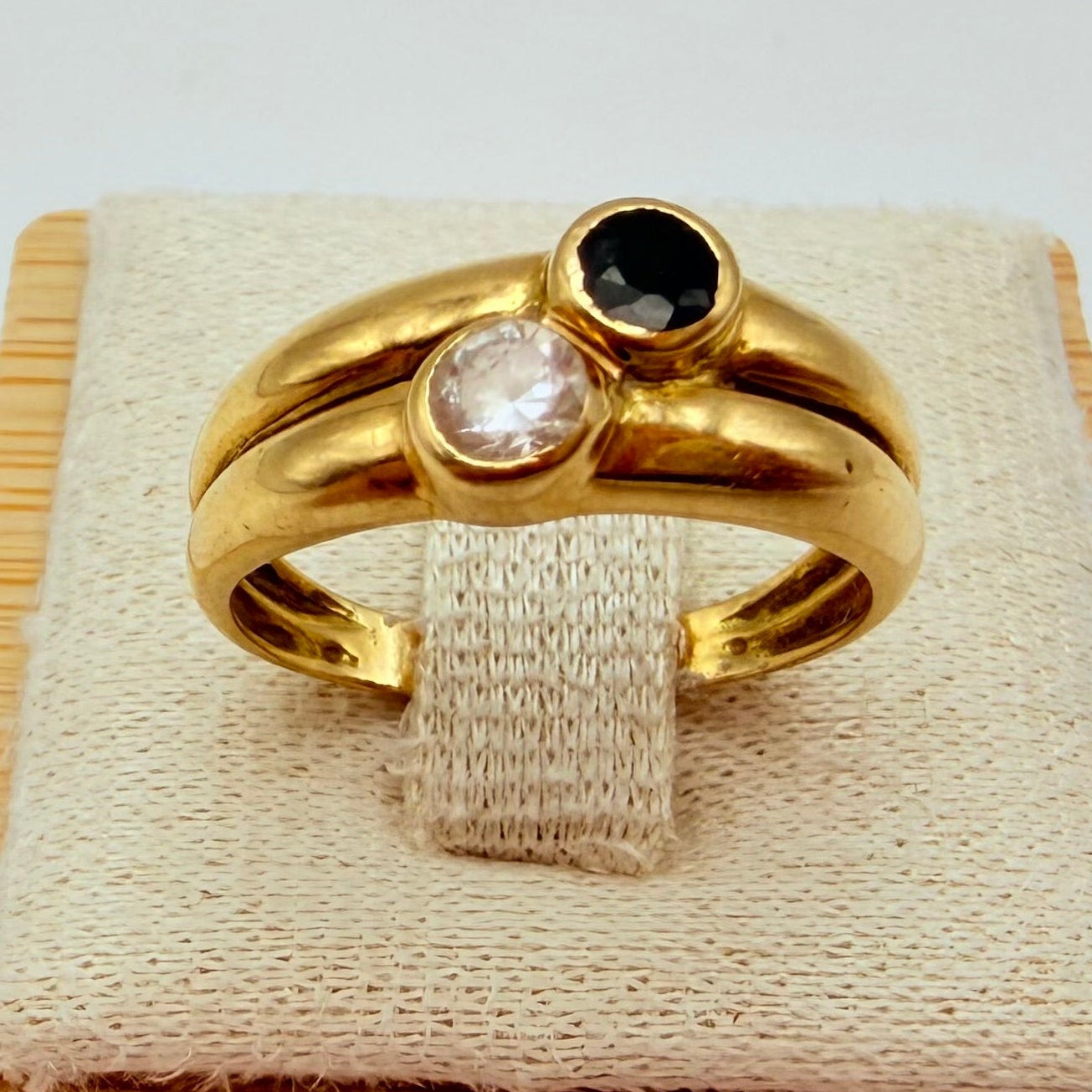 Bague empierrée en or jaune 18 carats (750/1000), poinçonnée 750, alliant élégance et qualité. D’un poids de 3,2 grammes, elle offre un port confortable et une belle présence au doigt. Sertie de deux oxydes de zirconium, elle révèle une brillance raffinée et lumineuse.