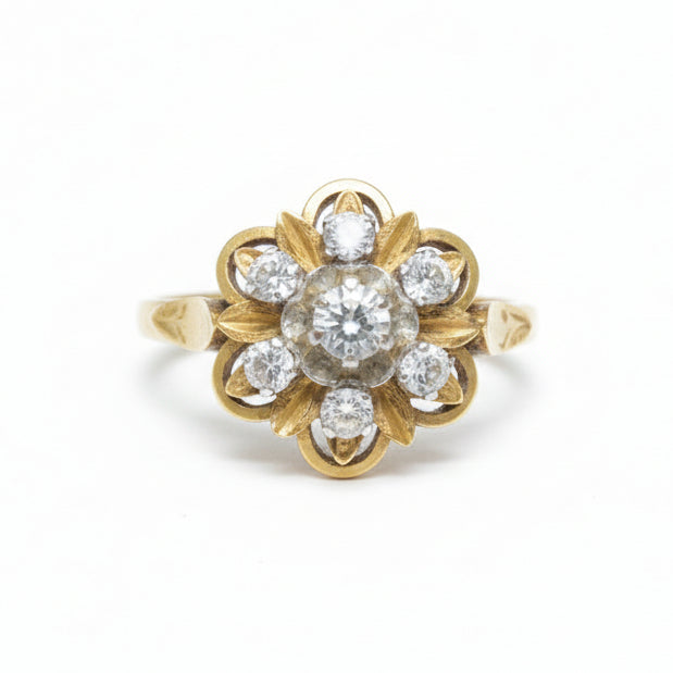 Bague chou en or jaune 18 carats (750/1000), sertie de 7 diamants dont 6 diamants de 0,05 carat et 1 diamant de 0,10 carat. Poinçon Tête d’Aigle, poids 3,55 g, taille 53. Bijou en bon état, élégant et lumineux.